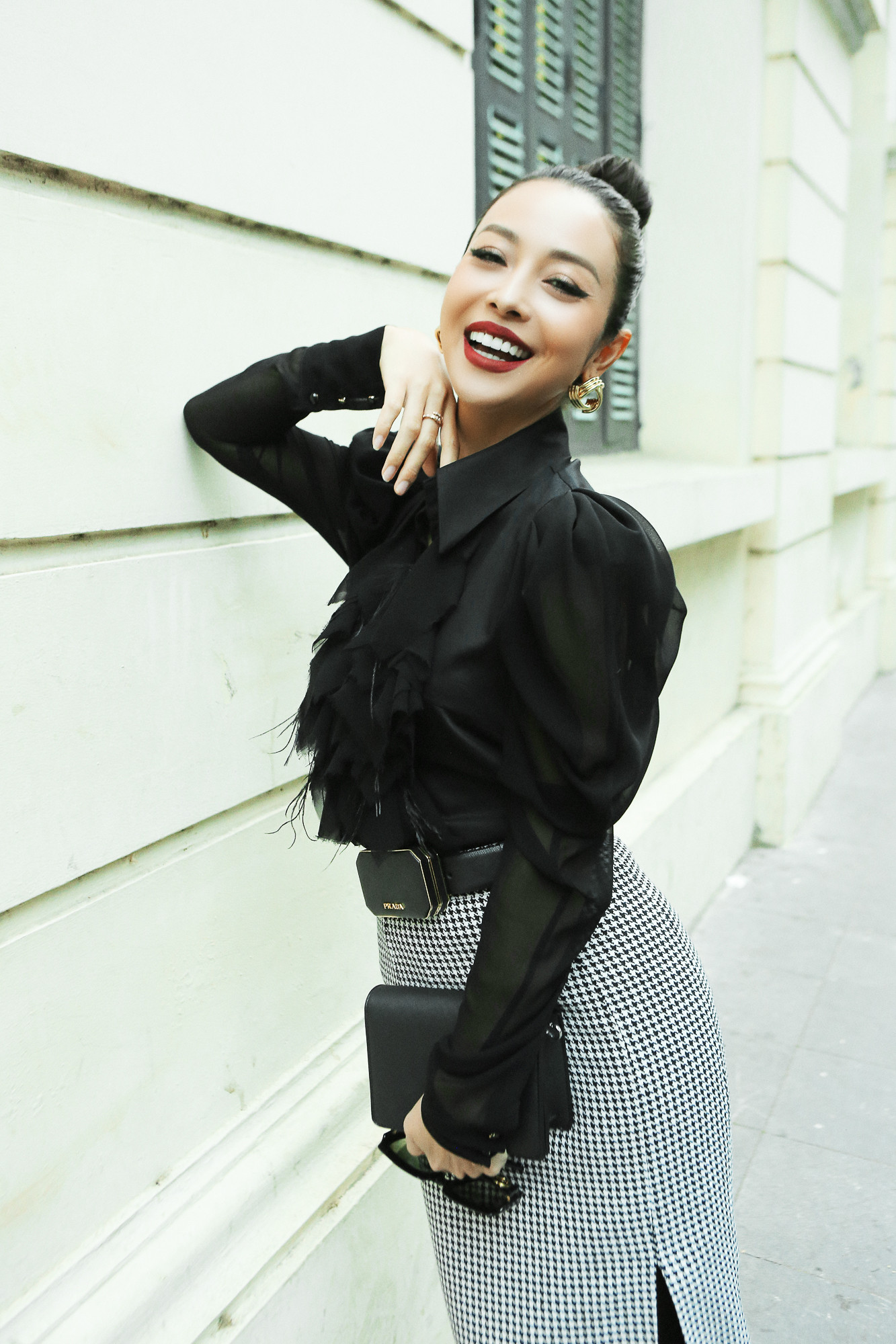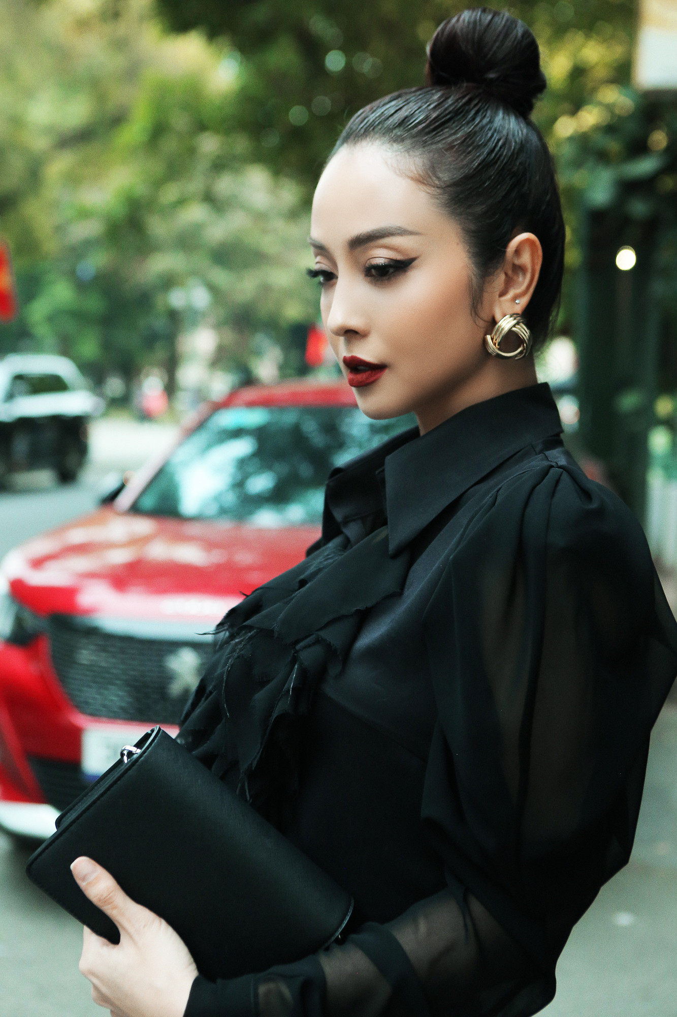 Đây là hai gam màu kinh điển, quyền lực, trường tồn mãi mãi cùng thời gian. Không “phá cách” để tạo nên sự thay đổi về gout ăn mặc, Jennifer Phạm phối đồ theo công thức quen thuộc mà phái đẹp áp dụng thường ngày nhưng vẫn toát lên phong thái sang trọng, quyến rũ.