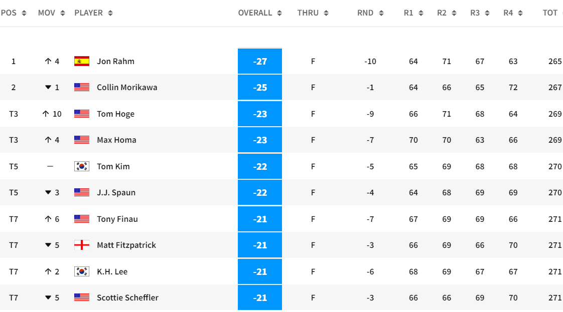 Chiến thắng này cũng là danh hiệu PGA Tour thứ 8 của Rahm, người hiện xếp thứ 5 thế giới.