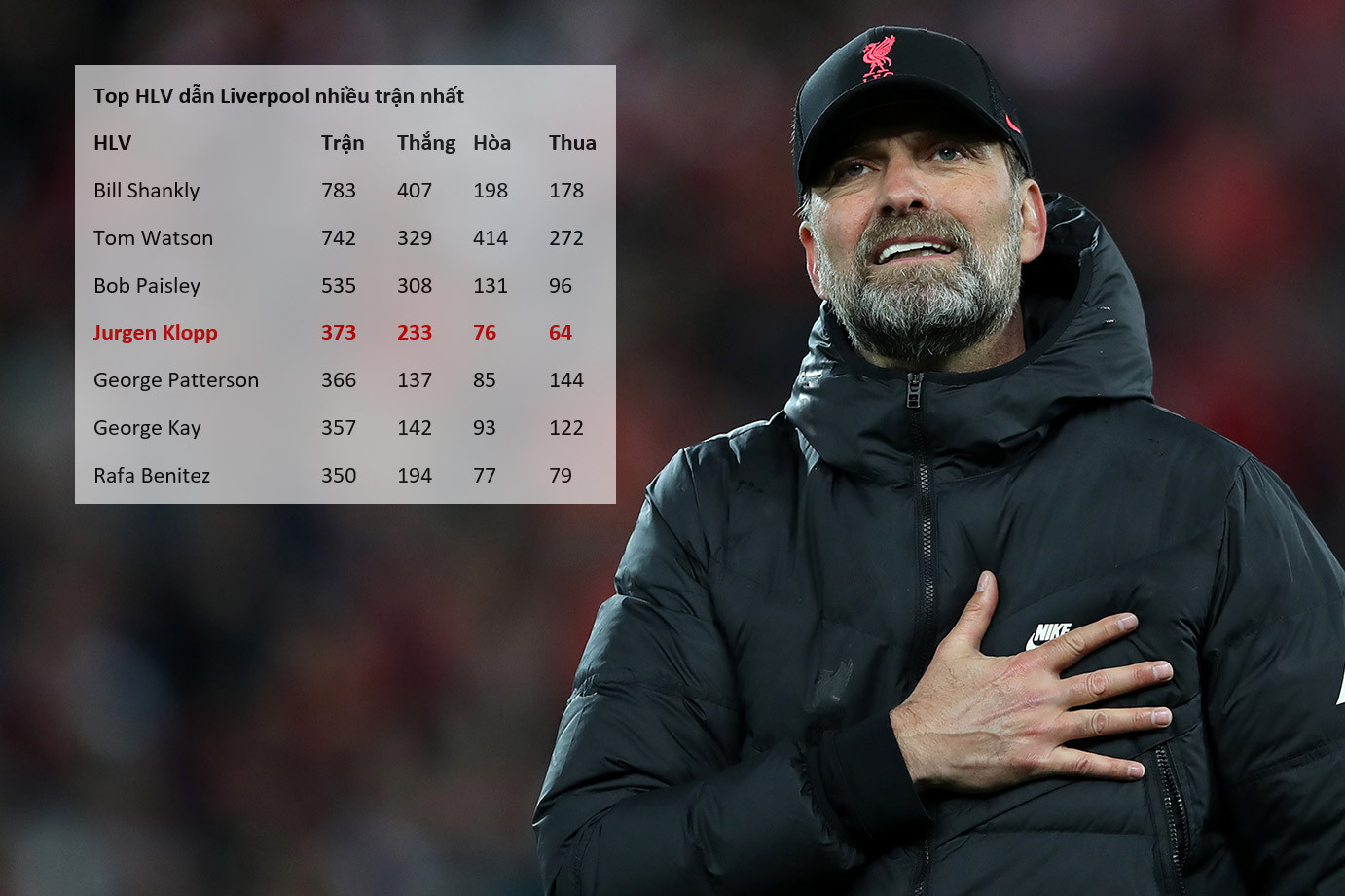 Jurgen Klopp hiện có 373 trận dẫn Liverpool với 233 chiến thắng. Với tham vọng tạo dựng một đế chế thống trị bóng đá châu Âu, ông hướng đến kỷ lục của một HLV ở Anfield: Bill Shankly với 783 trận và 407 chiến thắng.