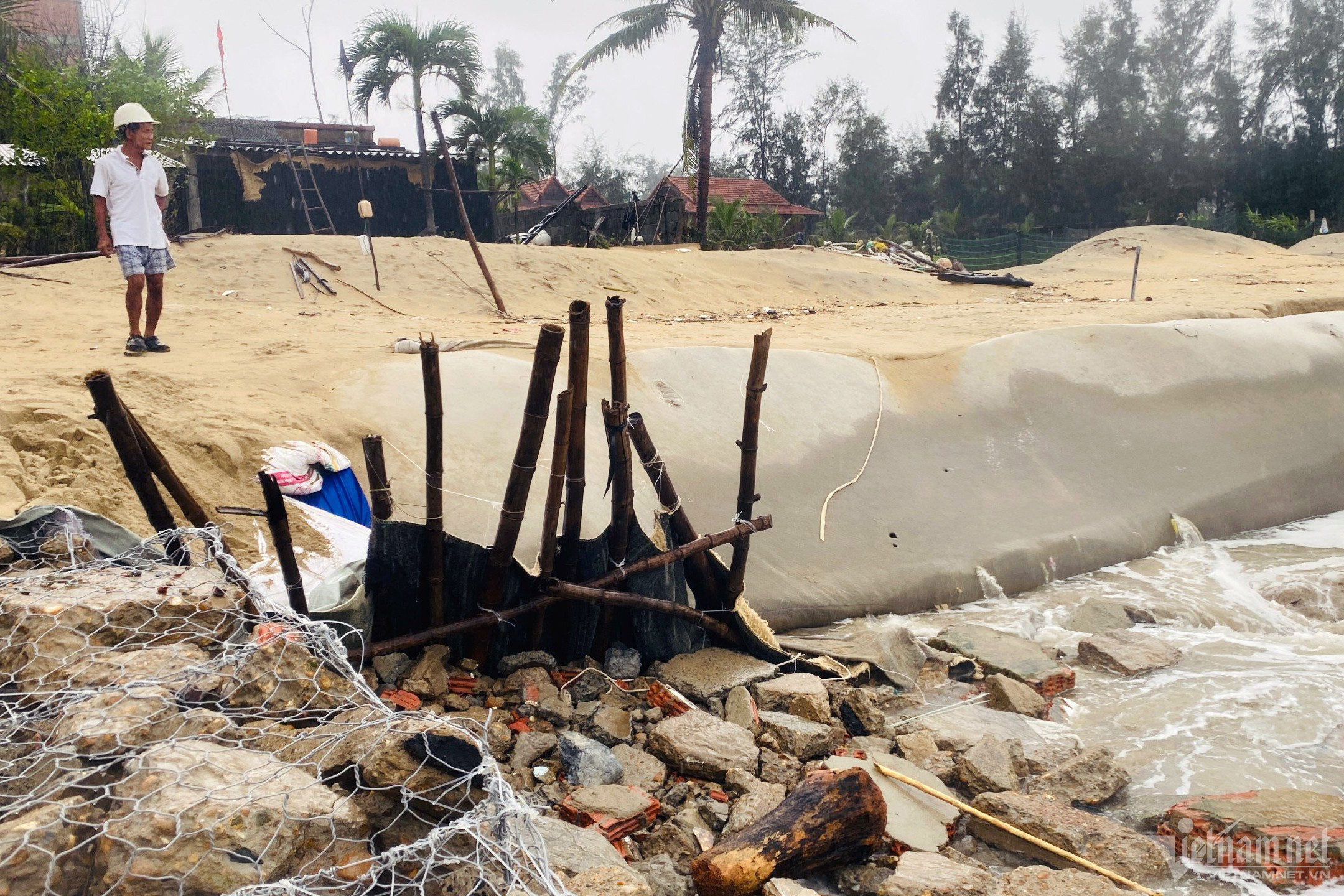 Sáng 14/10, sau trận mưa kéo dài cùng sóng mạnh khiến đoạn bờ biển ở khối Thịnh Mỹ, phường Cẩm An, TP Hội An bị sạt lở. Nước biển ăn sâu vào trong khu dân cư, chừng 100m. Dọc bờ biển này, hàng loạt cây phi lao chắn sóng bị bật gốc, nằm ngả nghiêng. Đoạn kè chắn sóng làm bằng tre, cùng hàng trăm bao cát được dựng lên chưa được bao lâu cũng tan hoang.