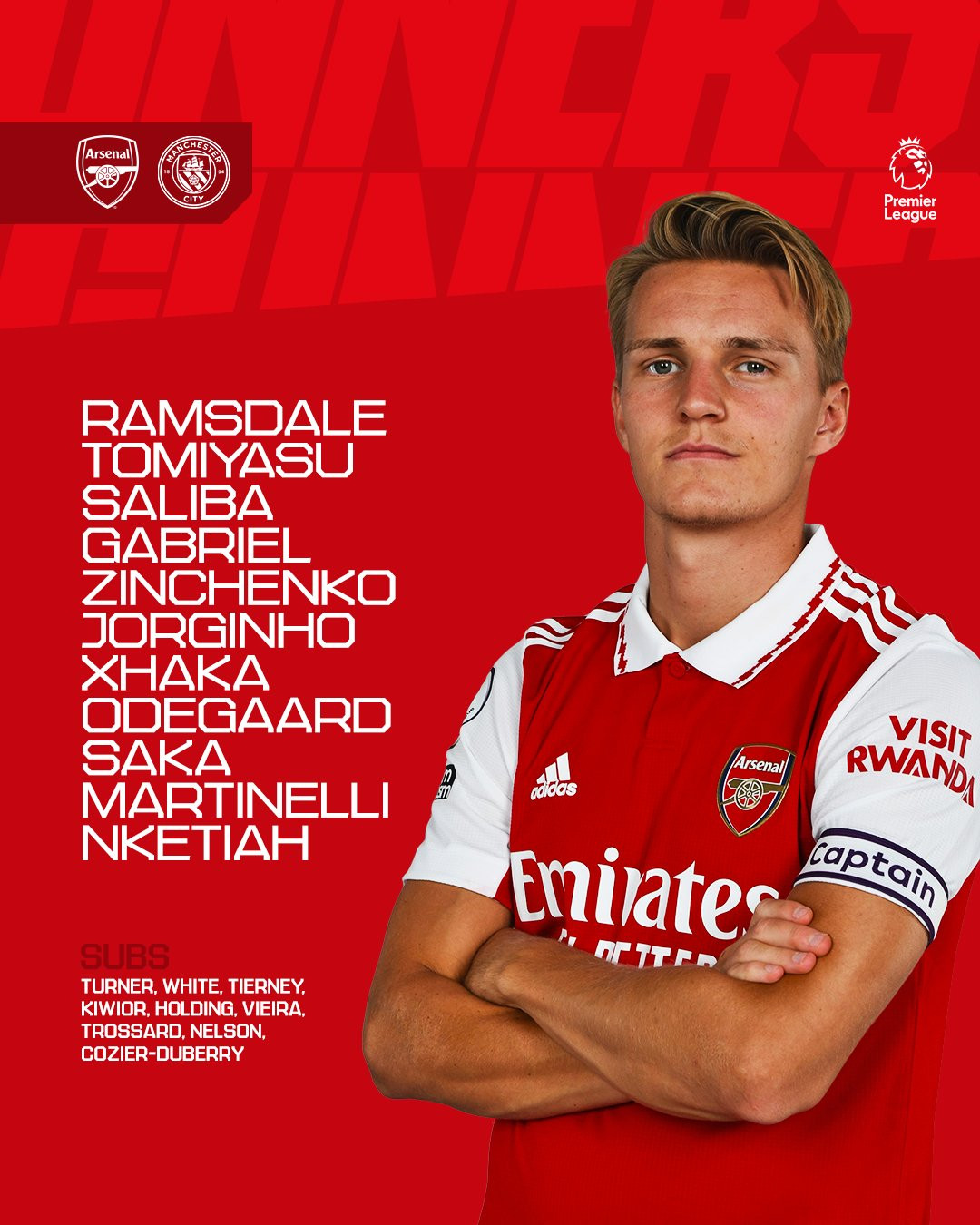 Arsenal: Ramsdale; Tomiyasu, Saliba, Gabriel, Zinchenko; Xhaka, Jorginho; Saka, Odegaard, Martinelli (Trossard 75'); Jesus.