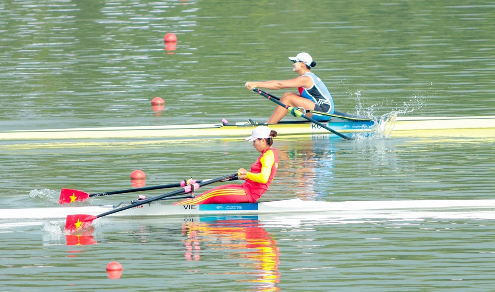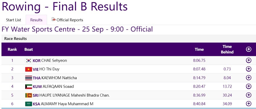VĐV Hồ Thị Duy về đích thứ 2 final B, nội dung thuyền đơn hạng nặng hai mái chèo và đứng thứ 8 chung cuộc.