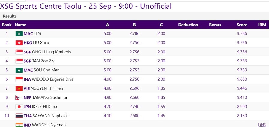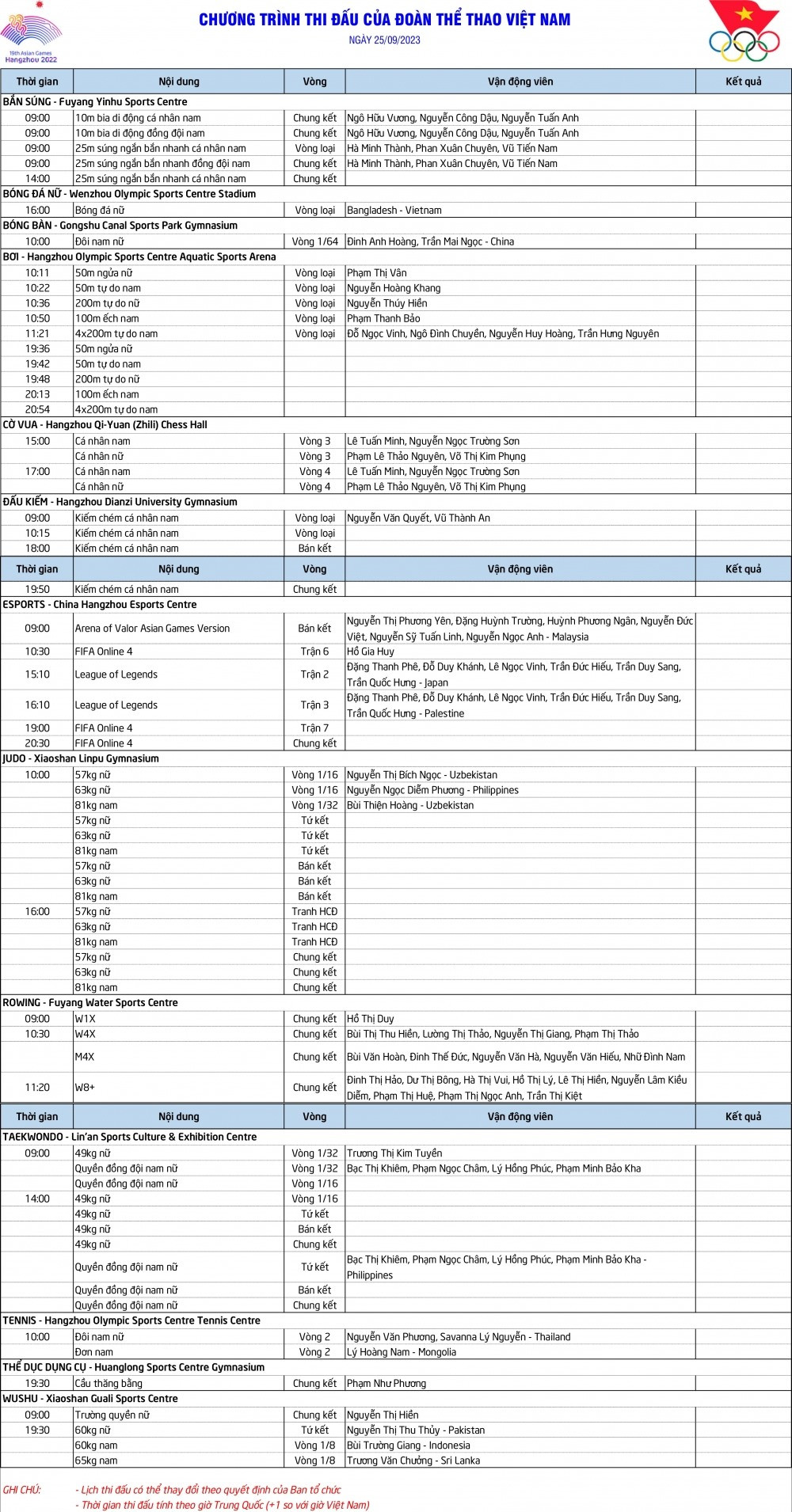 Hôm nay 25/9, Đoàn Thể thao Việt Nam thi đấu 13 môn: Bắn súng, Bóng đá nữ, Bóng bàn, Bơi, Cờ vua, Đấu kiếm, Thể thao điện tử, Judo, Rowing, Taekwondo, Quần vợt, Thể dục dụng cụ, Wushu.