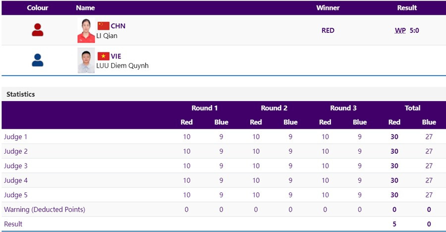 Võ sĩ Lưu Diễm Quỳnh bắt đầu trận bán kết gặp VĐV chủ nhà Trung Quốc Li Qian, ở bán kết hạng cân 75kg nữ.