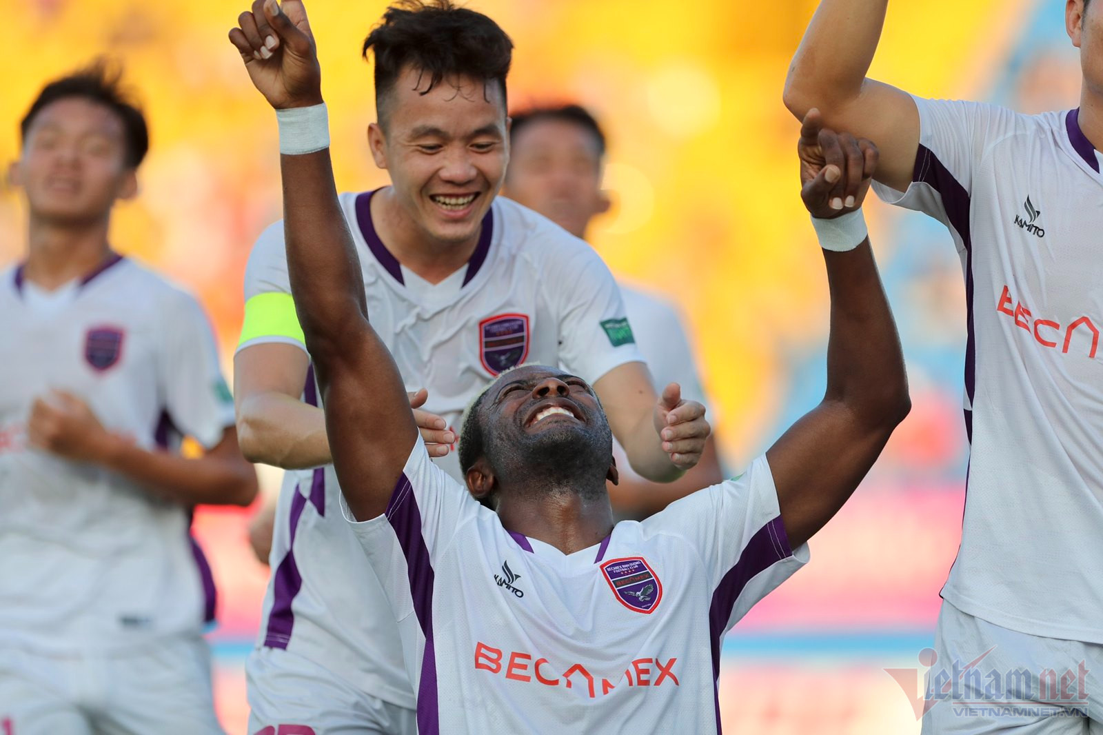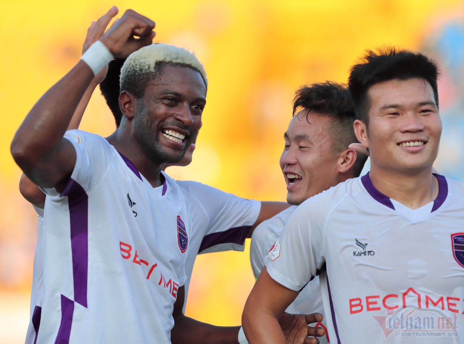 Vĩ Hào thoát xuống bên cánh trái trước khi trả bóng ngược ra để tiền đạo Eydison thực hiện pha chích mùi giày đánh bại thủ môn Văn Phong.