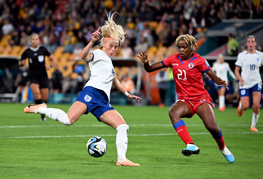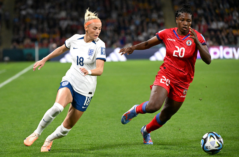 CĐV tuyển nữ Anh có phen thót tim khi Haiti phản công sắc lẹm. Tiền đạo vừa vào sân Eloissaint lẻn xuống cứa lòng buộc thủ thành Earps phải trổ tài cứu thua.