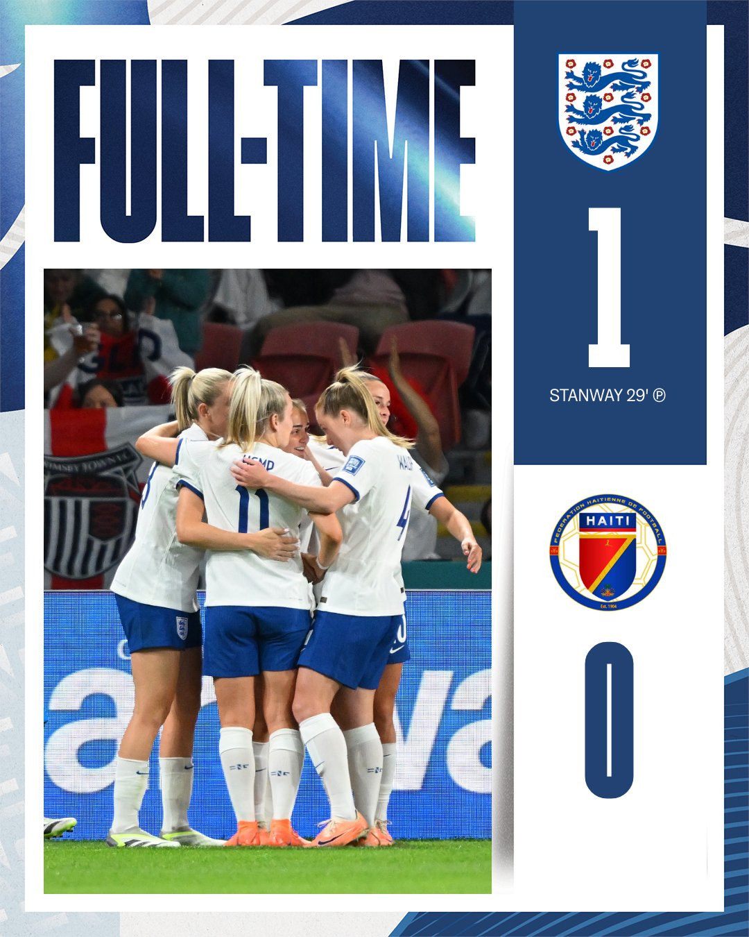 Bàn thắng (1-0, Stanway penalty): Trên chấm 11m, Stanway không thắng được thủ môn Theus. Tuy nhiên, trọng tài cho tuyển nữ Anh thực hiện lại quả penalty do người gác đền Haiti phạm luật.