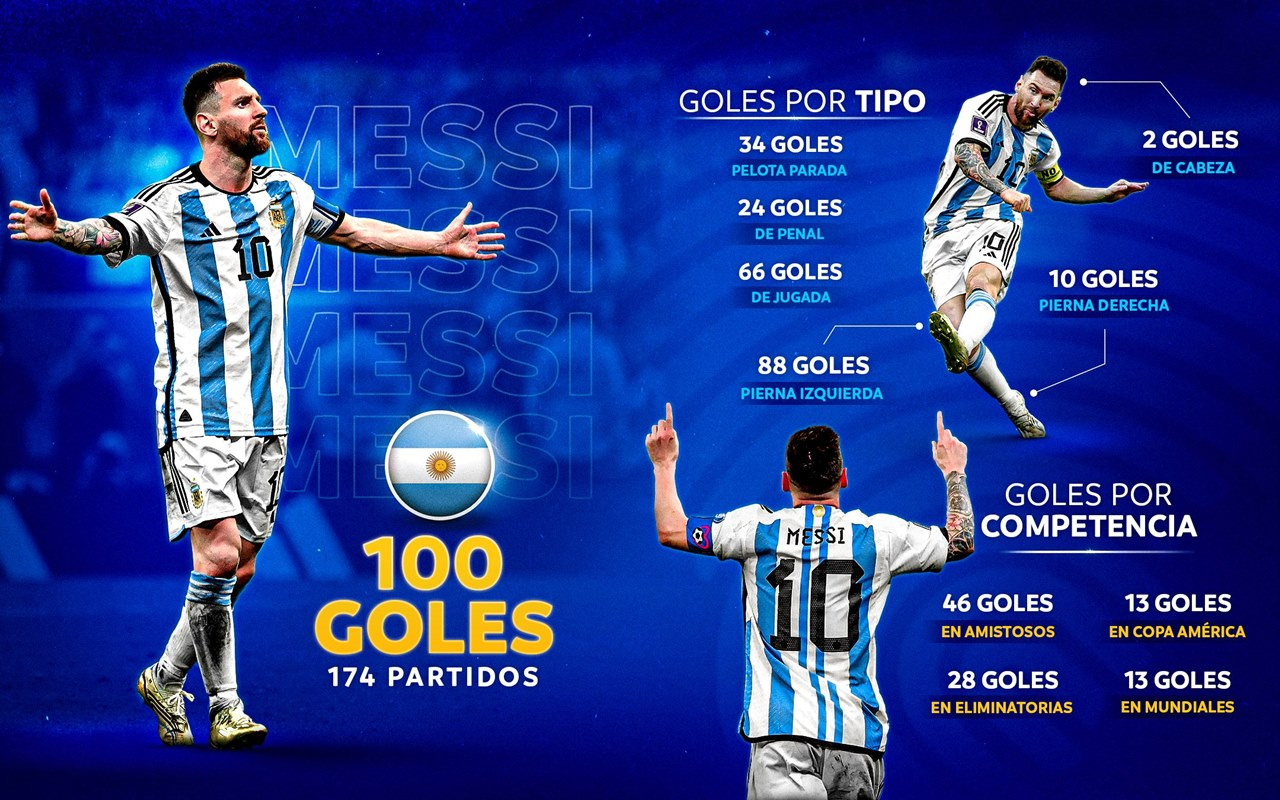 Cú hat-trick đó giúp Messi vượt mốc 100 bàn thắng cho ĐTQG. Trước đó, chỉ hai cầu thủ ghi hơn 100 bàn cho ĐTQG là Cristiano Ronaldo (Bồ Đào Nha - 122 bàn) và Ali Daei (Iran - 109 bàn).Tiền đạo sắp bước sang tuổi 36 vẫn là trụ cột và đầu tàu của nhà ĐKVĐ World CupArgentina khép lại kỳ FIFA Days với 2 trận giao hữu toàn thắng, ghi 9 bàn và không để thủng lưới lần nào