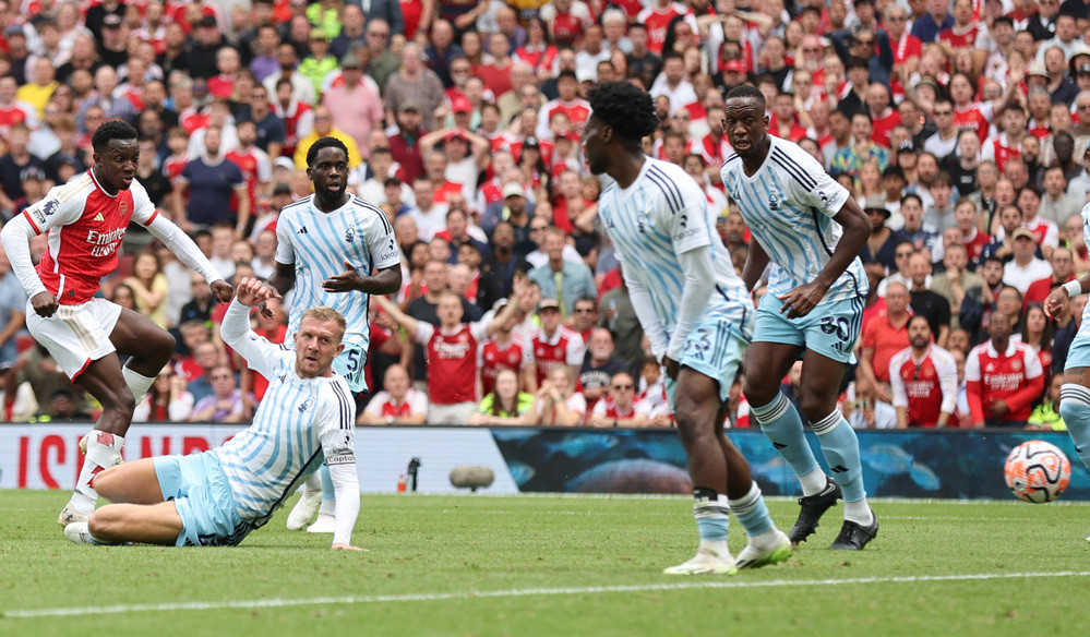 Nketiah xâm nhập vòng cấm quăng chân volley ngay nhưng bị hậu vệ Nottingham Forest truy cản.