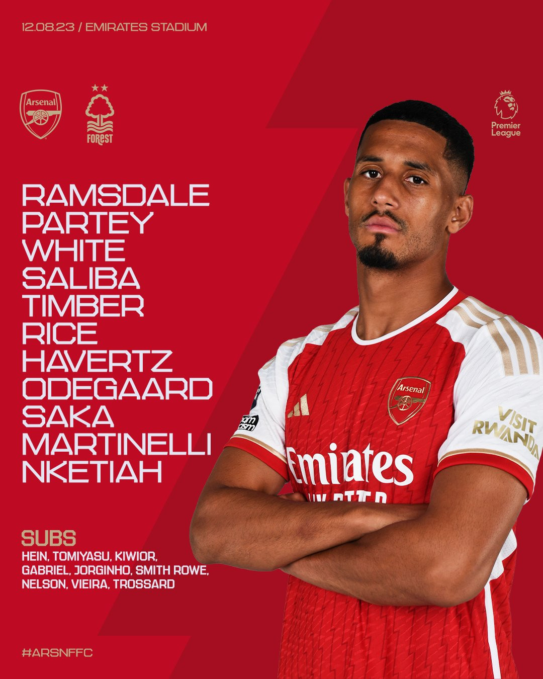 Arsenal: Ramsdale; White, Saliba, Timber; Odegaard, Partey, Rice; Saka, Havertz, Martinelli, Nketiah.