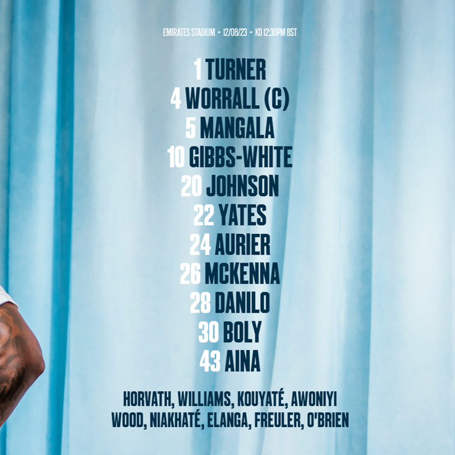Nottingham Forest: Turner; Worrall, Boly, McKenna; Aurier, Yates, Danilo, Mangala, Aina; Gibbs-White, Johnson.