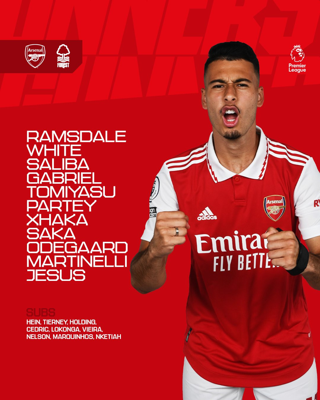 Arsenal: Ramsdale, White, Gabriel, Saliba, Tomiyasu, Xhaka, Partey, Saka (Nelson 27'), Odegaard, Martinelli, Jesus.