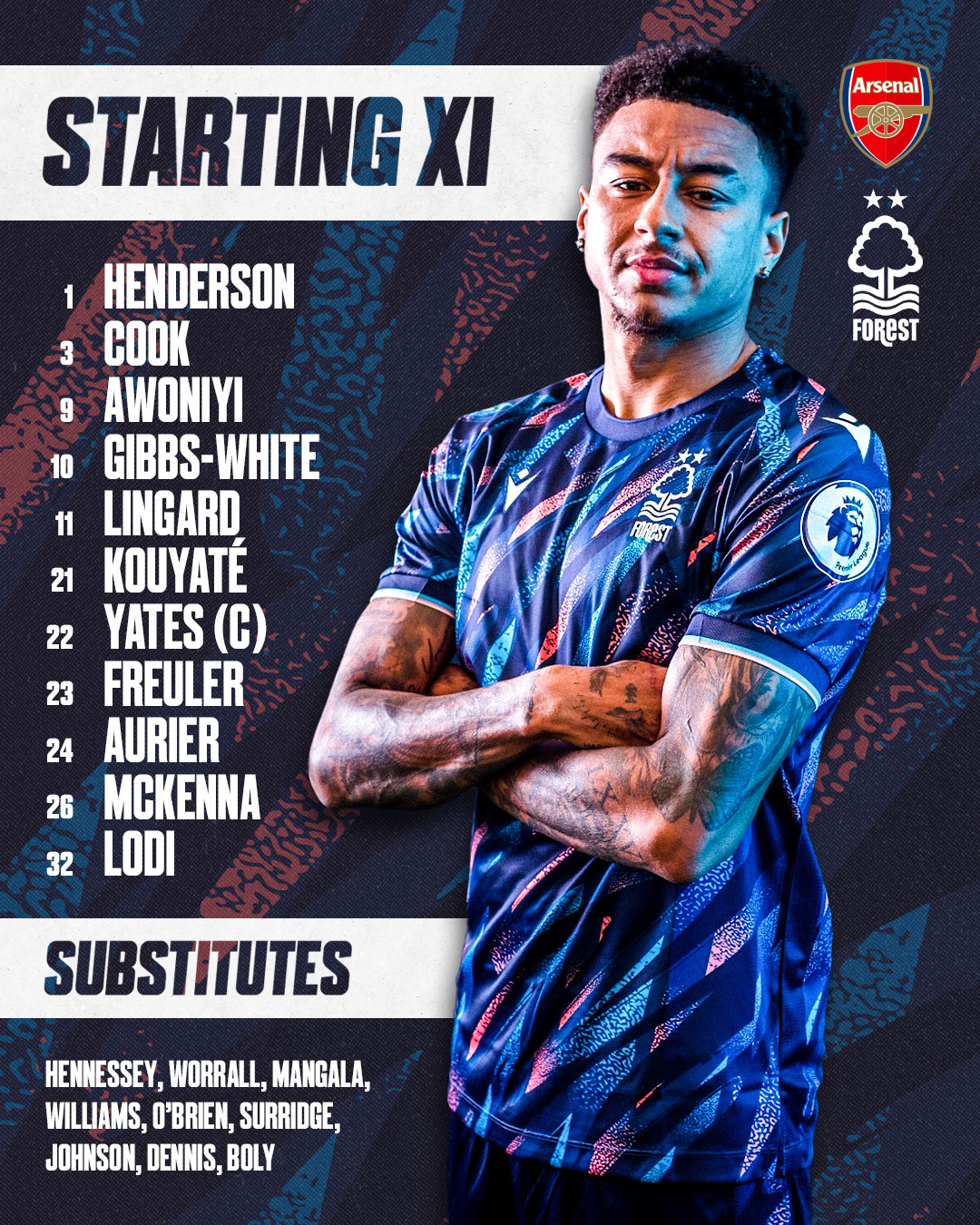 Nottingham Forest: Henderson, Aurier, Steve Cook, McKenna, Renan Lodi, Kouyate, Yates, Freuler, Gibbs White, Awoniyi, Lingard.