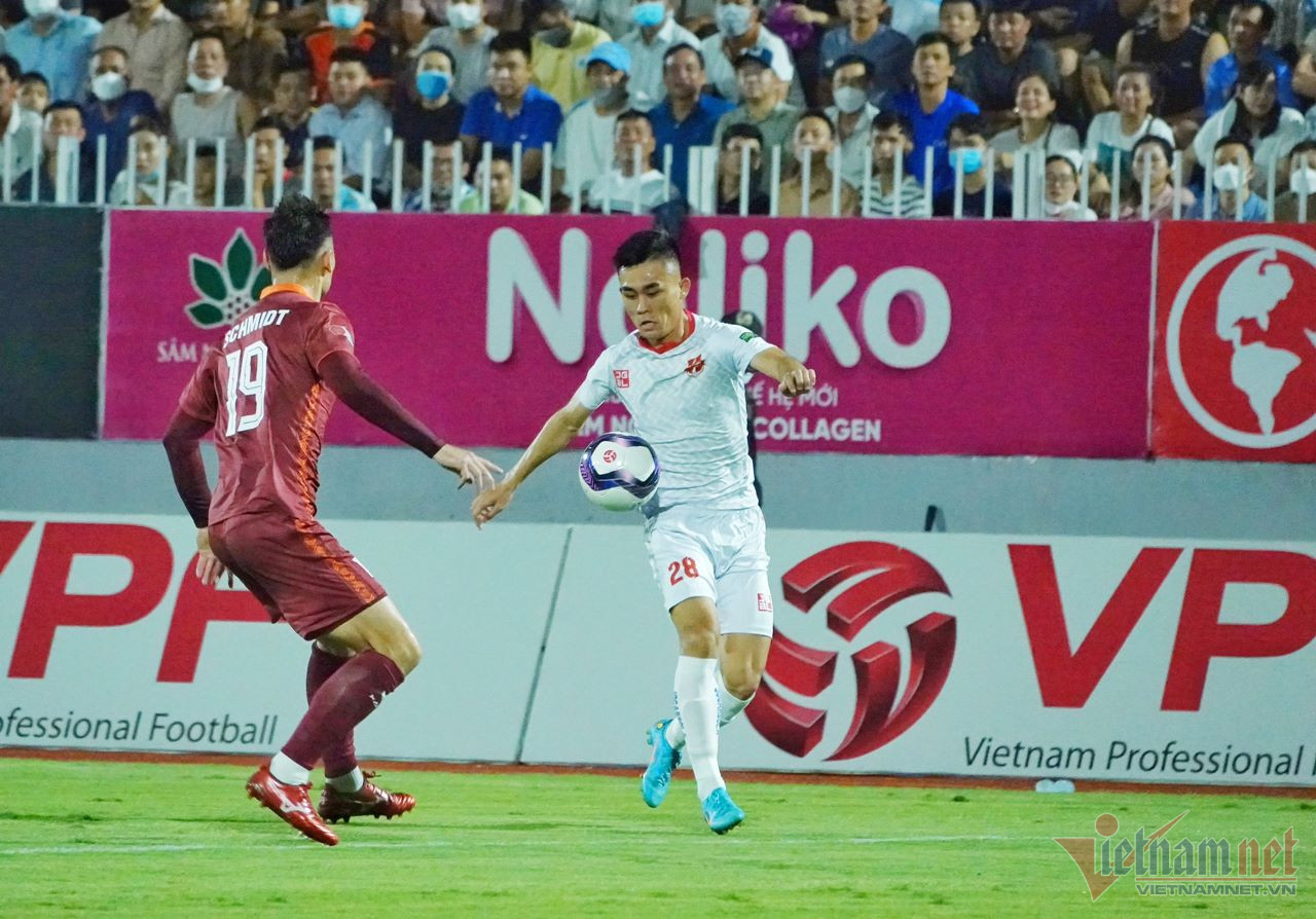 Triệu Việt Hưng tì đè loại bỏ Hồ Tấn Tài trước khi thực hiện cú vuốt bóng rất nhanh vừa qua tầm kiểm soát của thủ môn Văn Lâm. May cho Bình Định khi bóng dội trên nóc lưới phía trên khung thành chủ nhà.
