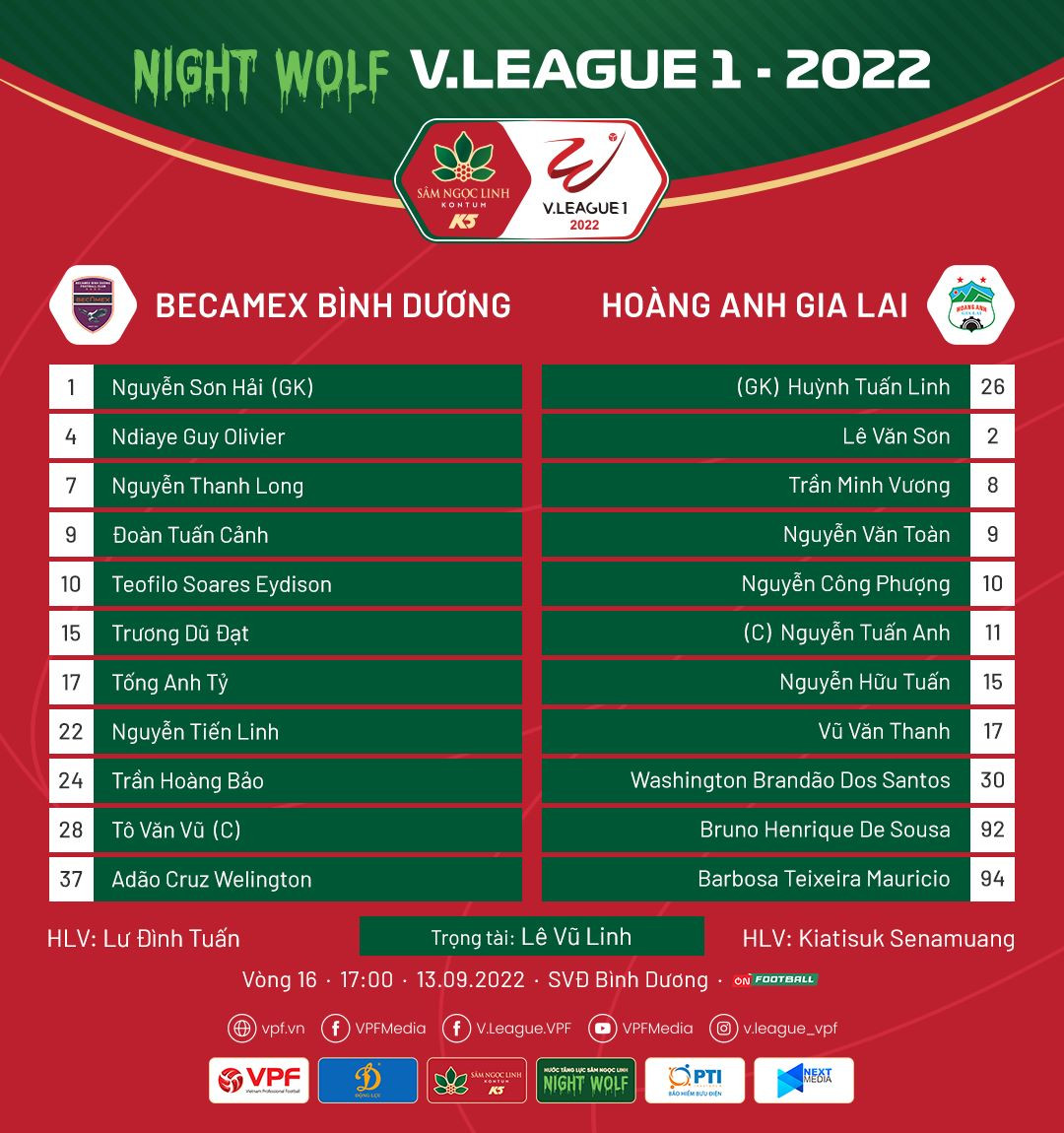 Bình Dương: Sơn Hải, Hoàng Bảo, Thanh Long, Olivier, Tuấn Cảnh, Dũ Đạt, Anh Tỷ, Eydison, Văn Vũ, Tiến Linh, Welington.