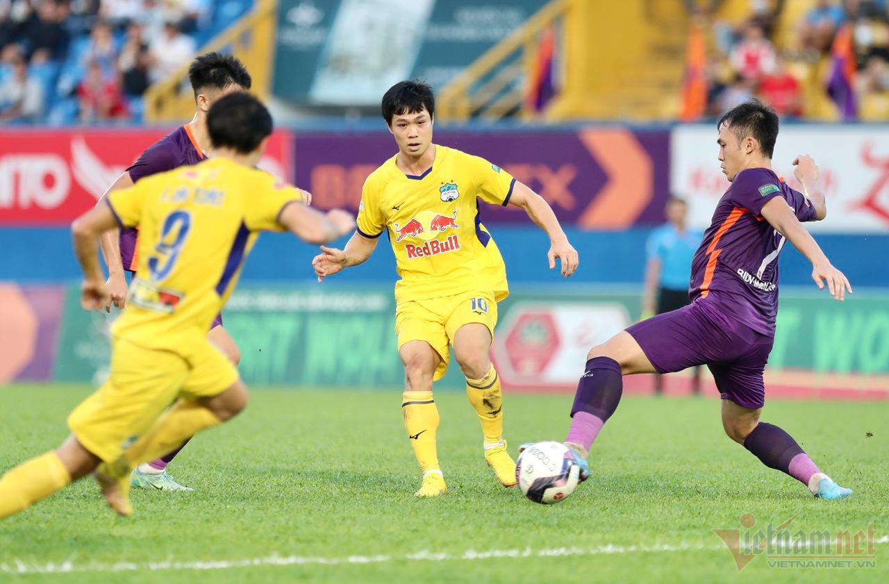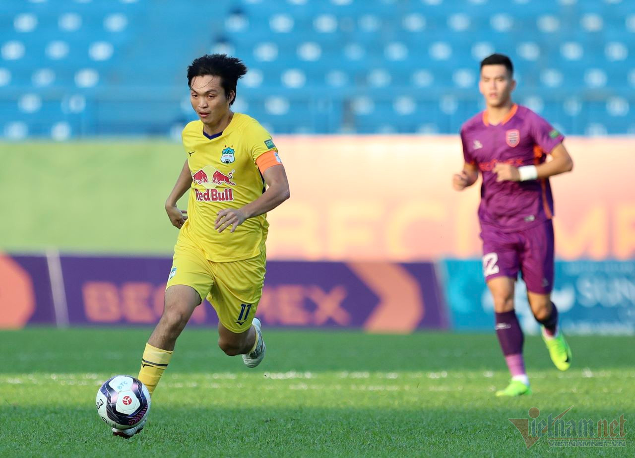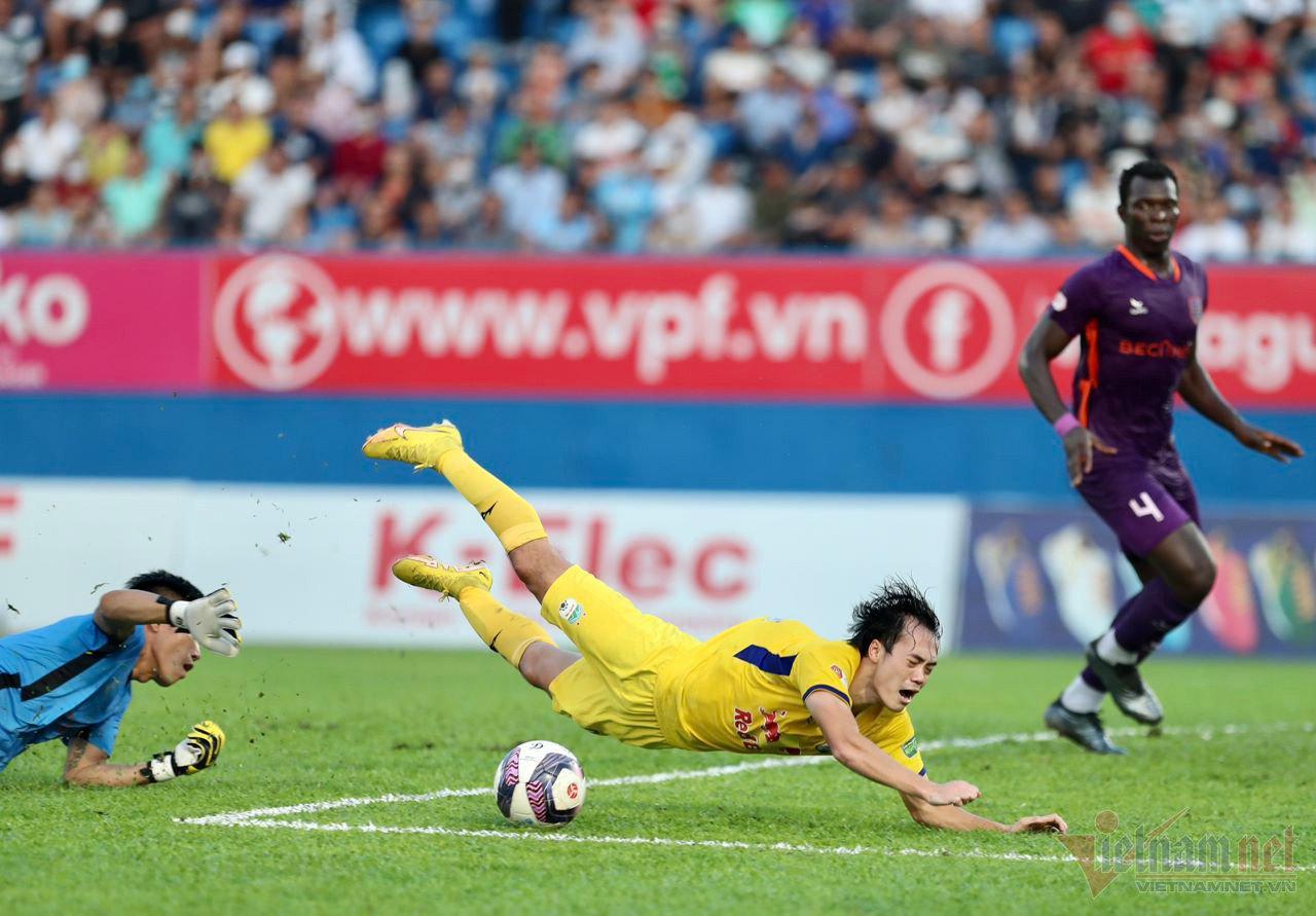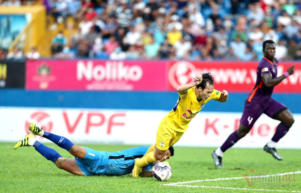 Công Phượng chuyền bóng dọn cỗ để Văn Toàn thoát xuống đối mặt với Sơn Hải. Tiền đạo quê Hải Dương bị ngã nhưng trọng tài Lê Vũ Linh cho rằng không có lỗi của thủ môn chủ nhà.