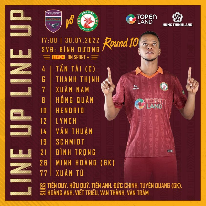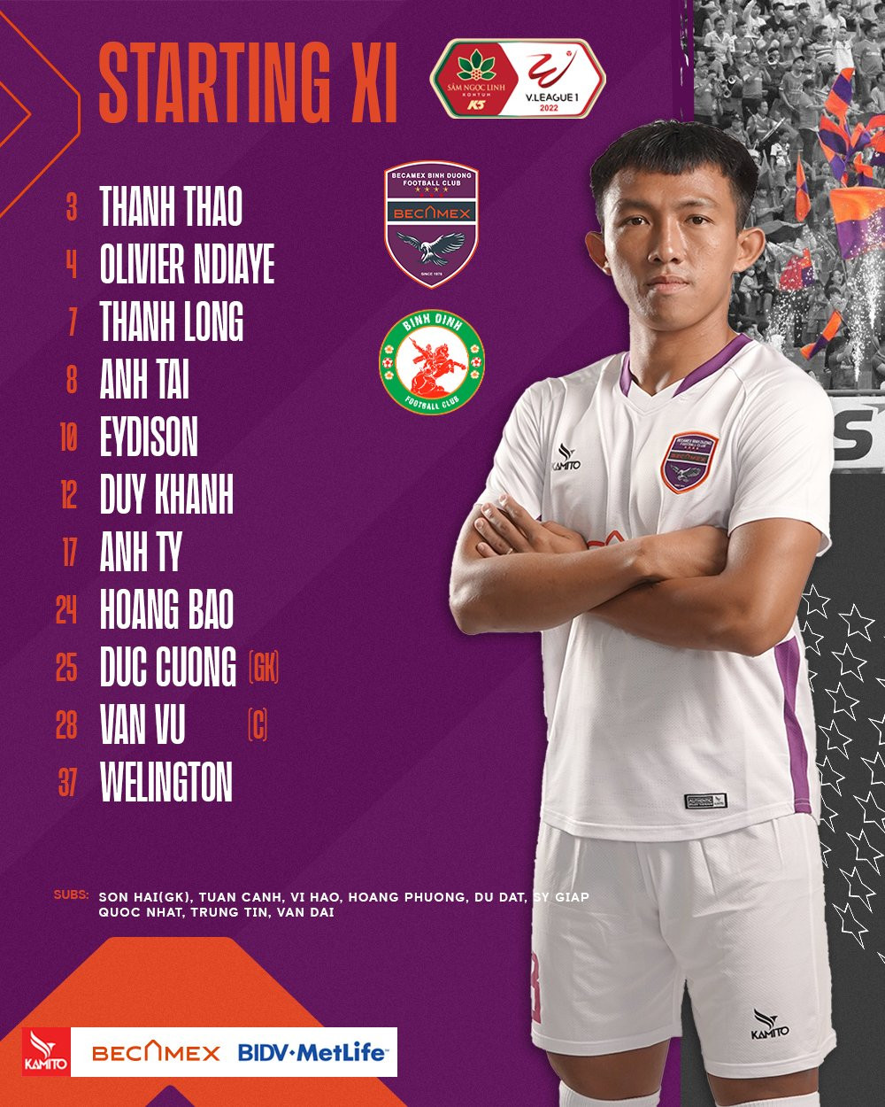 Bình Định: Minh Hoàng (thủ môn), Tấn Tài, Đình Trọng, Adriano Schmidt, Văn Thuận, Thanh Thịnh, Hồng Quân, Xuân Tú, Hendrio, Xuân Nam, Jermie Lynch