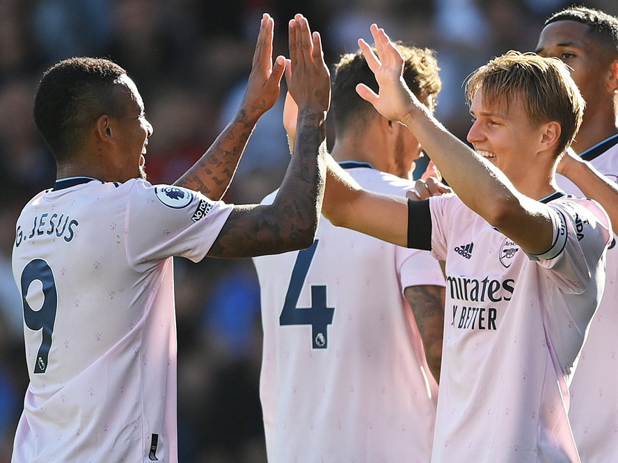 Bàn thắng (2-0, Martin Odegaard): Hàng thủ chủ nhà tiếp tục bộc lộ sơ hở. White lao lên bên cánh phải rồi trả ngược để Gabriel Jesus. Odegaard đá nối rất căng nhân đôi cách biệt cho Pháo thủ.