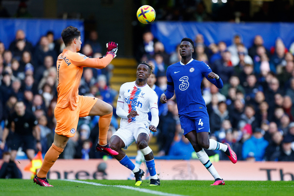 Wilfried Zaha nã đại bác ở góc hẹp nhưng chưa đủ khó để đánh bại Kepa.