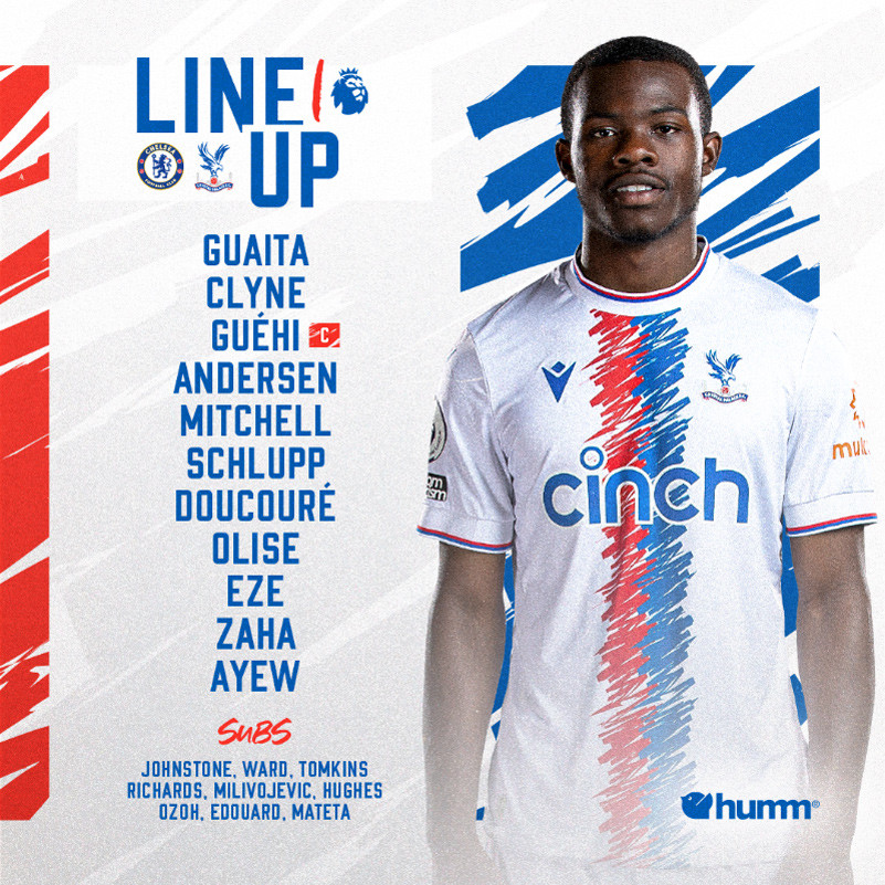 Crystal Palace: Guaita, Clyne, Guehi, Andersen, Mitchell, Schlupp, Olise, Doucoure, Eze, Jordan Ayew, Zaha.