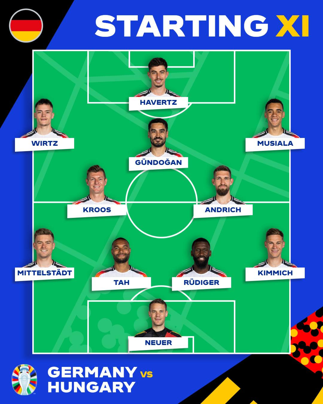 Đức: Manuel Neuer (1), Joshua Kimmich (6), Antonio Rüdiger (2), Jonathan Tah (4), Maximilian Mittelstädt (18), Robert Andrich (Emre Can 72'), Toni Kroos (8), Jamal Musiala (Chris Führich 72'), İlkay Gündoğan (Deniz Undav 84'), Florian Wirtz (Leroy Sane 58'), Kai Havertz (Niclas Füllkrug 58')