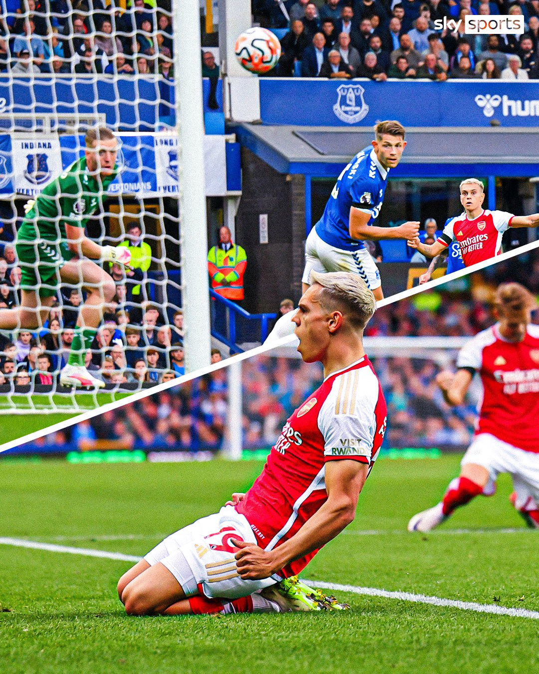 Odegaard băng xuống dứt điểm chân phải buộc Pickford phải trổ tài. Fabio Vieira lao vào đá bồi bị hậu vệ áo xanh cản phá.