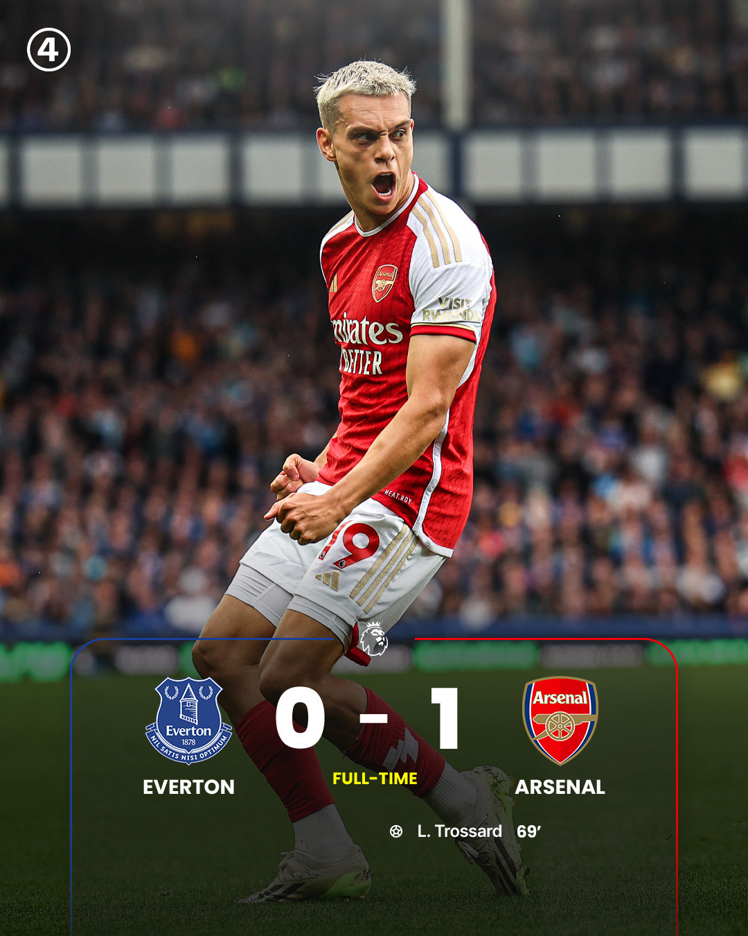 Bàn thắng (0-1, Trossard): Arsenal dàn xếp đá phạt góc bài bản. Saka lẻn xuống rồi trả ngược cho Trossard đá nối chân trái rất nhanh mở tỷ số cho Pháo thủ.