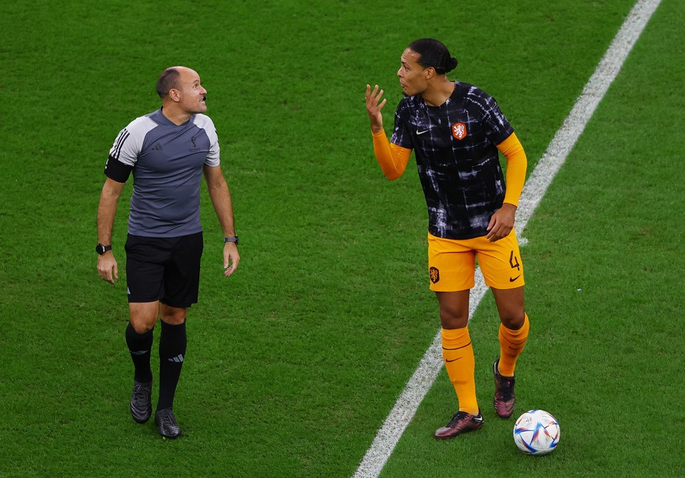 Trung vệ Virgil van Dijk và trọng tài chính Antonio Mateu Lahoz trong lúc khởi động
