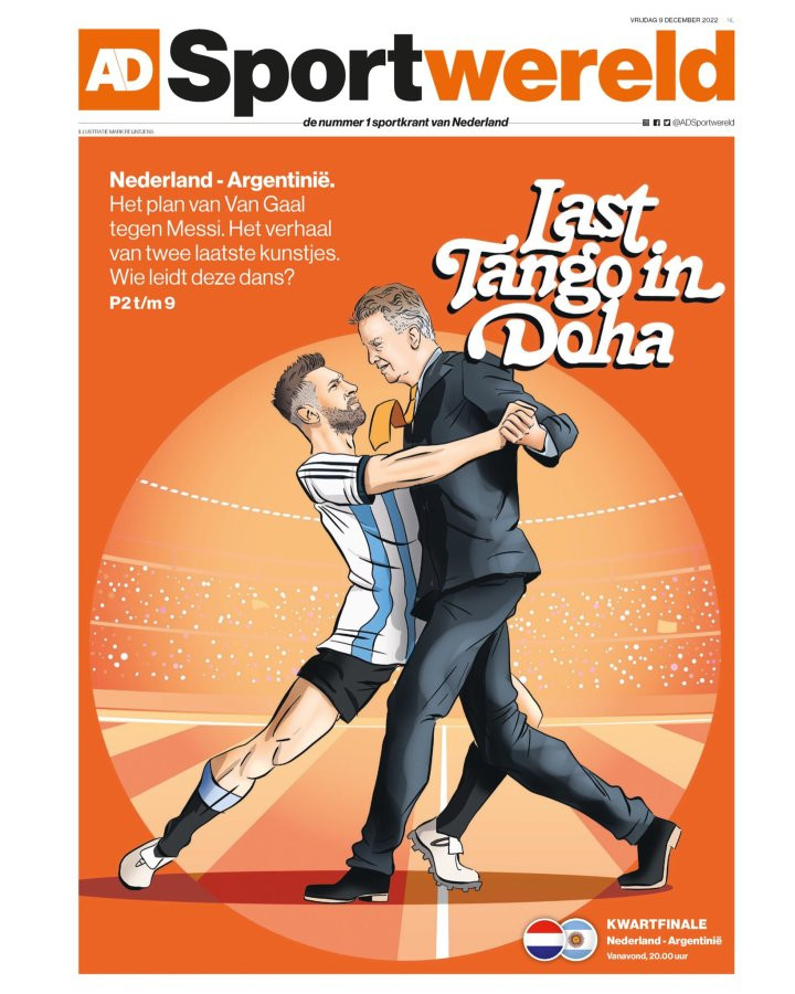 Trong phiên bản thể thao của mình, nhật báo AD - một trong hai tờ báo bán chạy nhất Hà Lan, sau De Telegraaf - đưa hình ảnh trận tứ kết giữa Hà Lan và Argentina trên trang nhất. Tờ báo chạy tiêu đề "Bản tango cuối cùng ở Doha", với Leo Messi và Louis van Gaal là nhân vật chính. Tờ báo đề cập: "Kế hoạch của Van Gaal chống lại Messi. Câu chuyện về hai mánh khóe muộn màng. Ai chỉ đạo điệu nhảy này?".