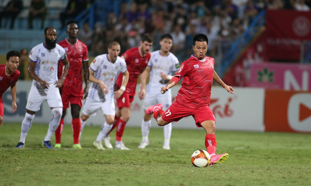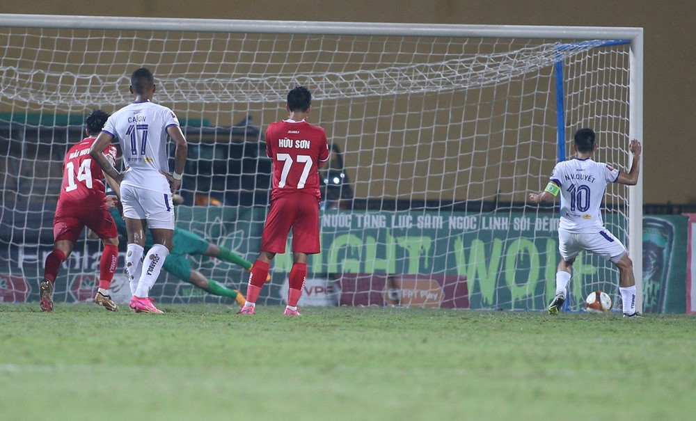 Đến lượt Hữu Sơn của Hải Phòng để tay chạm bóng trong vòng cấm, trọng tài Mai Xuân Hùng lập tức thổi phạt đền cho Hà Nội FC. Từ khoảng cách 11m, đội trưởng Văn Quyết dễ dàng đánh lừa Đình Triệu để tái lập thế dẫn trước cho nhà ĐKVĐ.