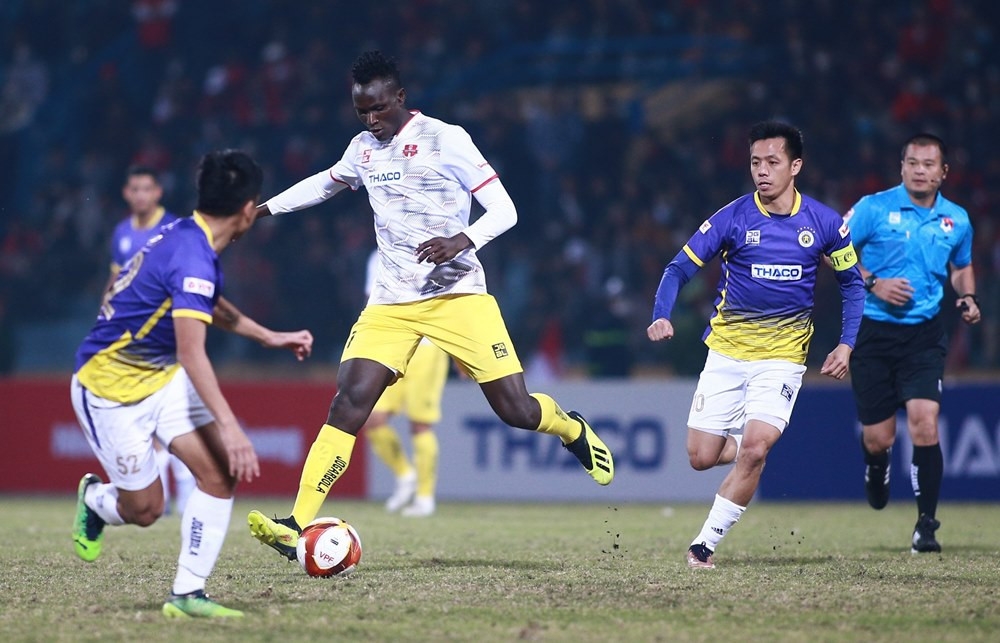 Mpande không thắng được thủ môn Tấn Trường trong pha đối mặt. Vẫn chưa có bàn thắng gỡ hòa cho Hải Phòng.