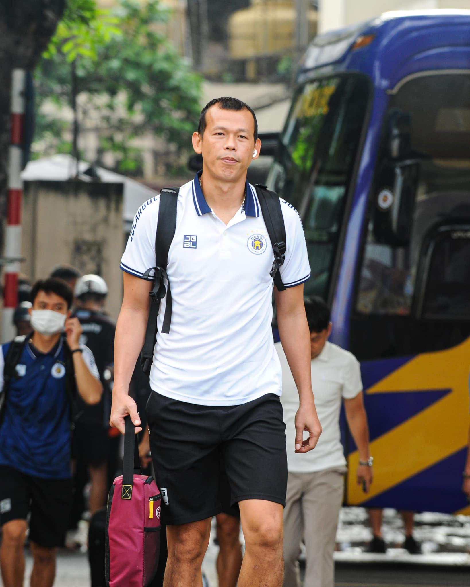 Các cầu thủ Hà Nội FC đến sân Hàng Đẫy chuẩn bị cho trận đấu.