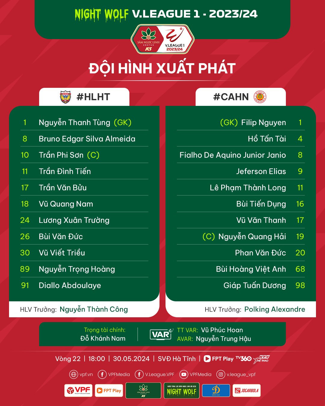CAHN: Nguyễn Filip (1), Việt Anh (68), Tuấn Dương (98), Tấn Tài (4), Văn Thanh (17), Tiến Dụng (16), Thành Long (11), Quang Hải (19), Junior Fialho (8), Văn Đức (20), Jeferson (9).