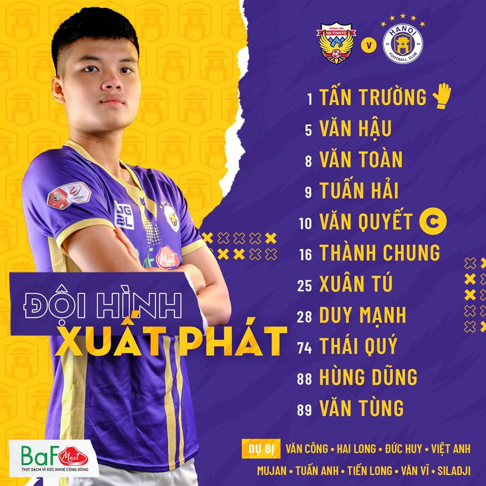 Hà Nội: Tấn Trường (thủ môn), Duy Mạnh, Thành Chung, Văn Hậu (Việt Anh 84'), Văn Toàn, Hùng Dũng, Văn Quyết, Thái Quý (Vũ Tiến Long 88'), Tuấn Hải, Xuân Tú (Tonci 56'), Văn Tùng (Siladji 56').