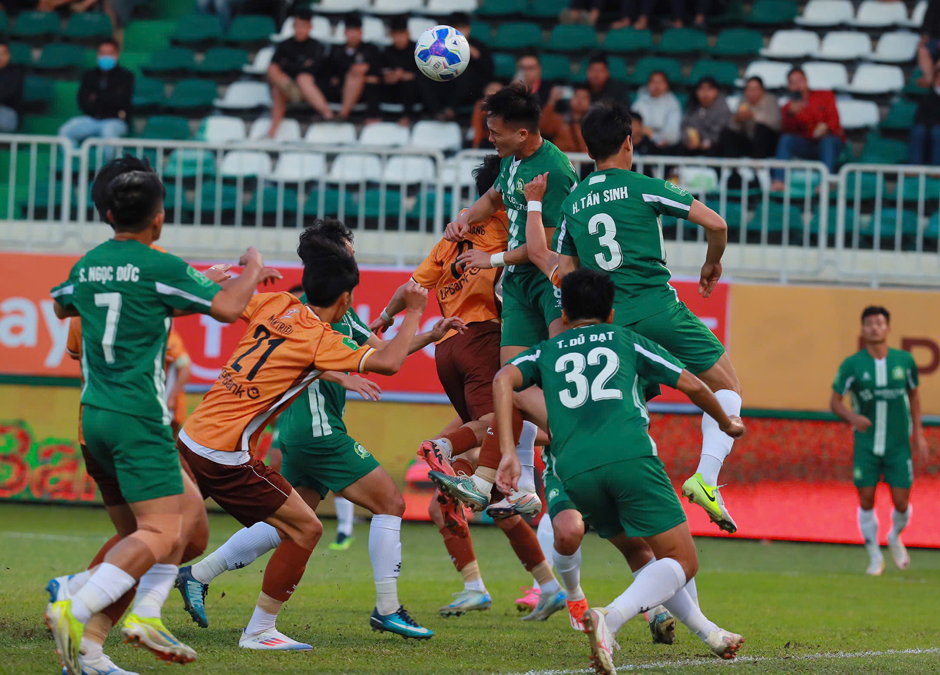 Văn Triệu bật cao đánh đầu từ pha phạt góc nhưng bóng đi vọt xà ngang khung thành Bình Phước.