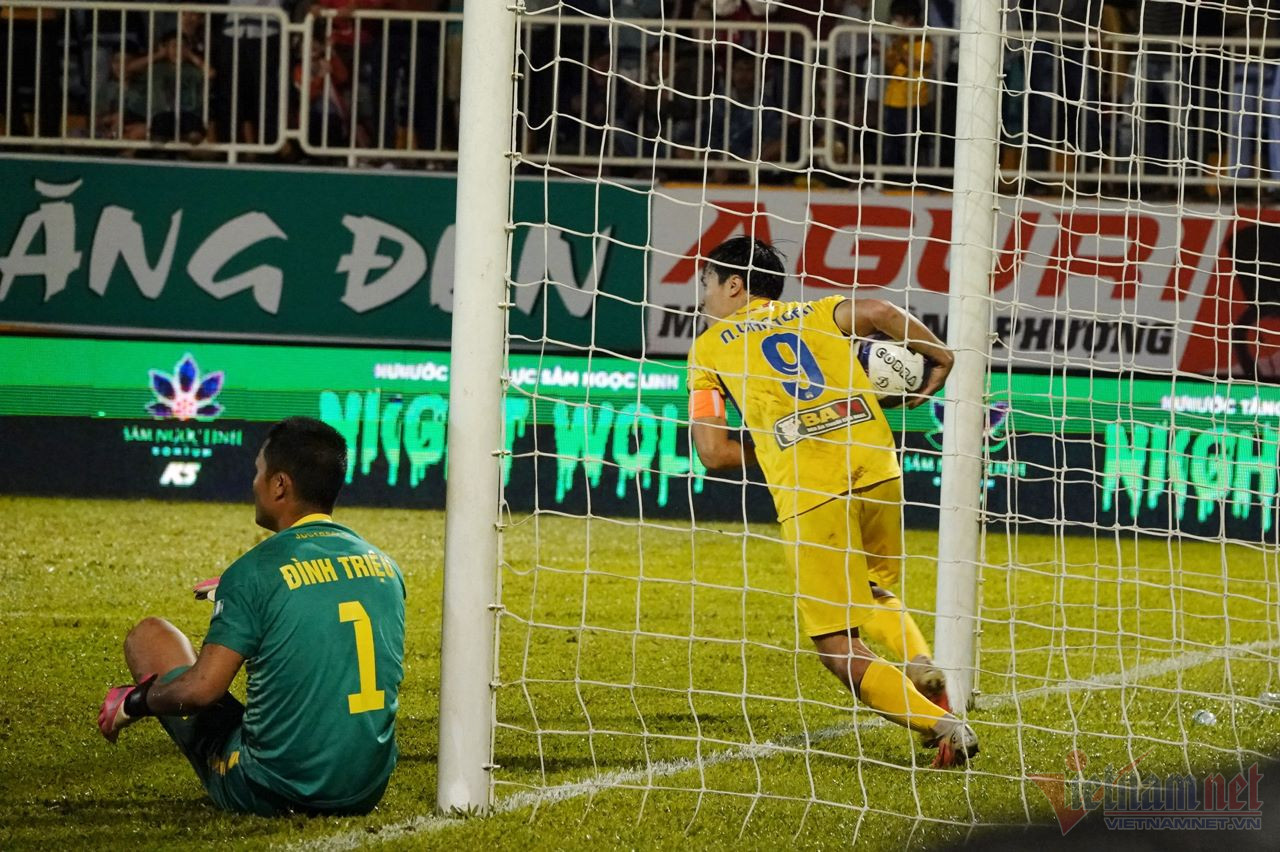 Văn Thanh xoay sở khéo léo rồi tạt bóng từ cánh trái vào như đặt để Brandao đánh đầu đưa bóng đi chệch cột dọc khung thành Hải Phòng chỉ gang tấc.