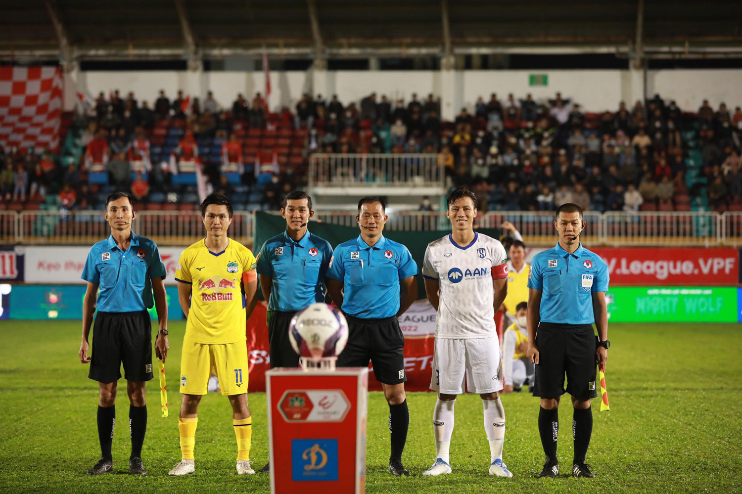 Hai đội bước ra sân làm thủ tục chuẩn bị cho trận đấu.