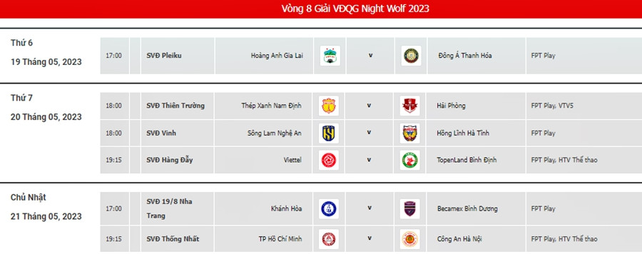 Lịch thi đấu vòng 8 V-League 2023 mới nhất