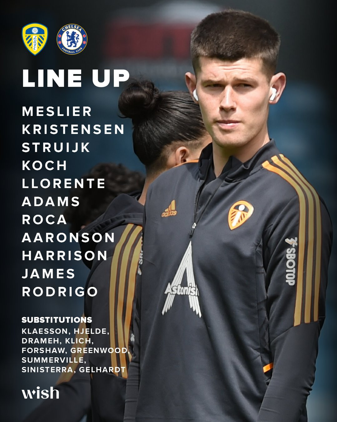 Leeds United: Meslier; Kristensen, Koch, Llorente, Struijk; Roca, Adams; Aaronson, Rodrigo, Harrison; James.