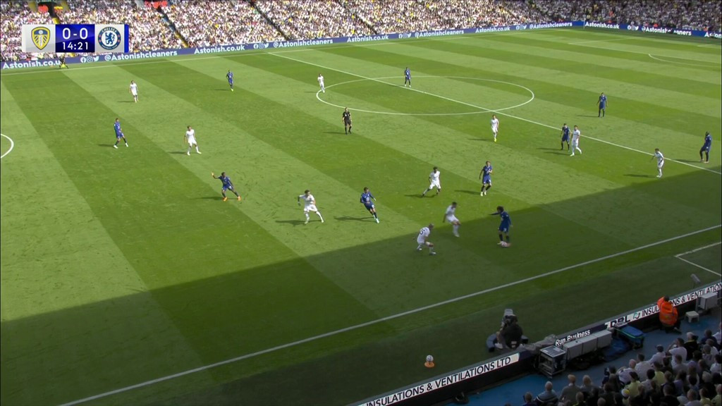 Mason Mount dẫn bóng phản công rồi kết thúc chìm bằng chân trái. May cho Leeds là thủ thành Meslier đổ người cứu thua xuất sắc.