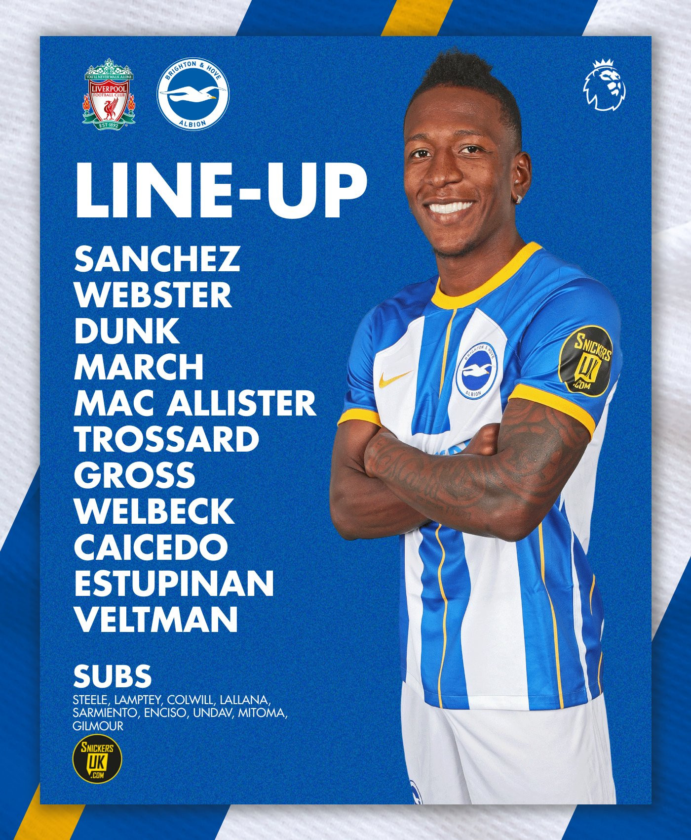 Brighton: Sanchez; Webster, Dunk, Veltman; Estupinan, Gross, Caicedo, Allister, March; Trossard, Welbeck.