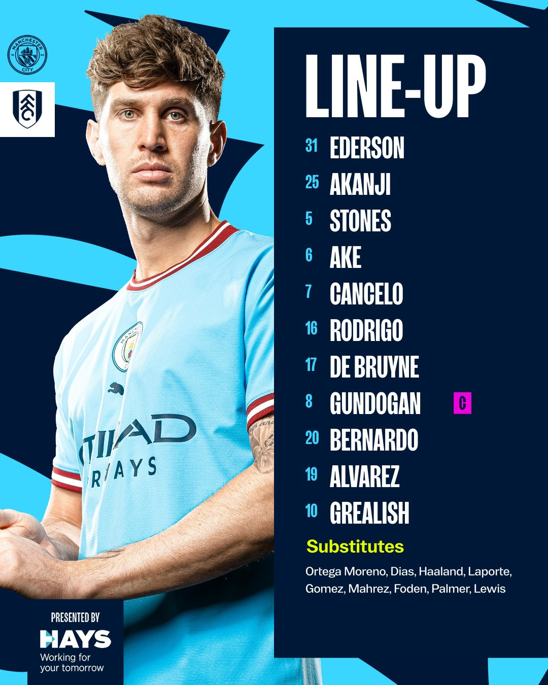 Man City: Ederson, Cancelo, Akanji, Ake, Stones, Rodri, Gundogan, De Bruyne, Bernardo Silva, Grealish (Foden 63'), Alvarez (Haaland 63').