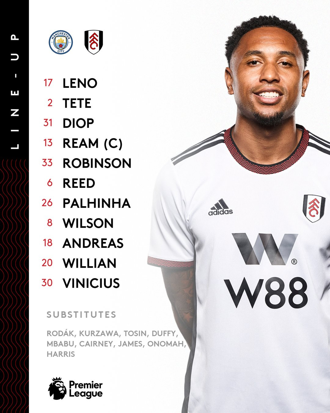 Fulham: Leno, Robinson, Ream, Diop, Tete, Palhinha, Reed, Wilson, Willian, Pereira, Vinicius.