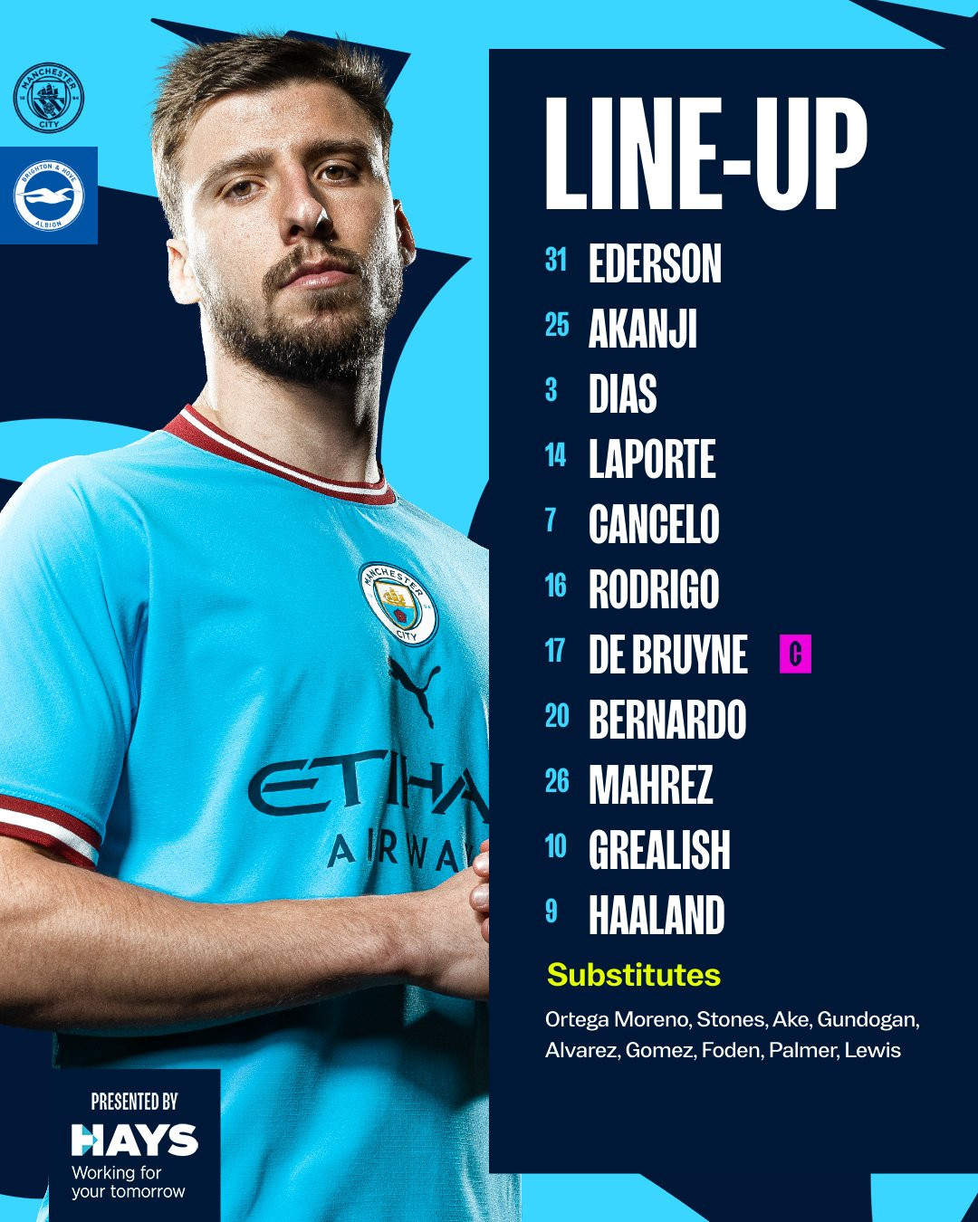 Man City: Ederson, Akanji, Dias, Laporte, Cancelo, Rodrigo, De Bruyne (c), Bernardo, Mahrez, Grealish, Haaland.