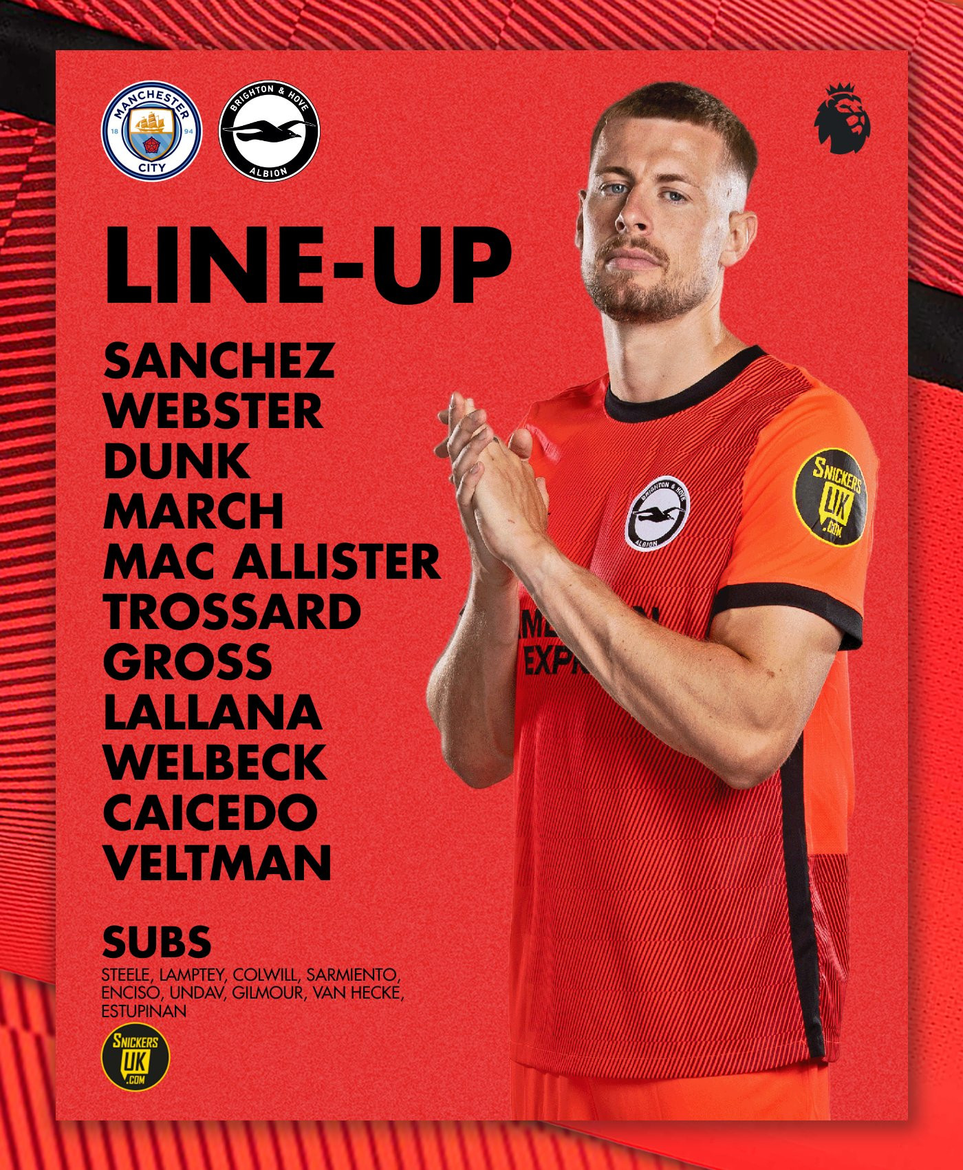 Brighton: Sanchez; Veltman, Dunk, Webster; March, Caicedo, MacAllister, Trossard; Lallana, Gross; Welbeck.