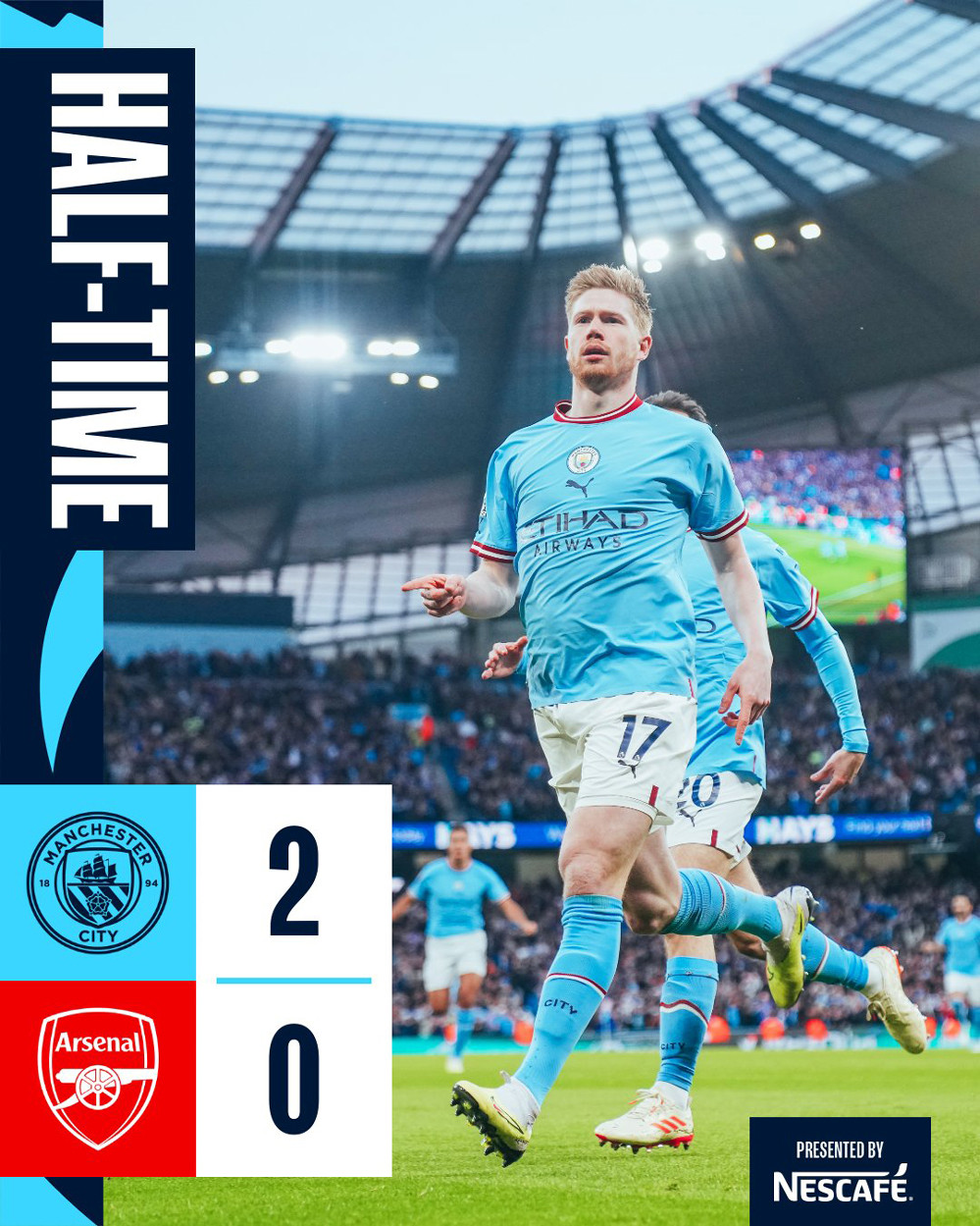 Bàn thắng (2-0, John Stones): De Bruyne đá phạt cho Stones lẻn xuống đánh đầu tung lưới Arsenal.