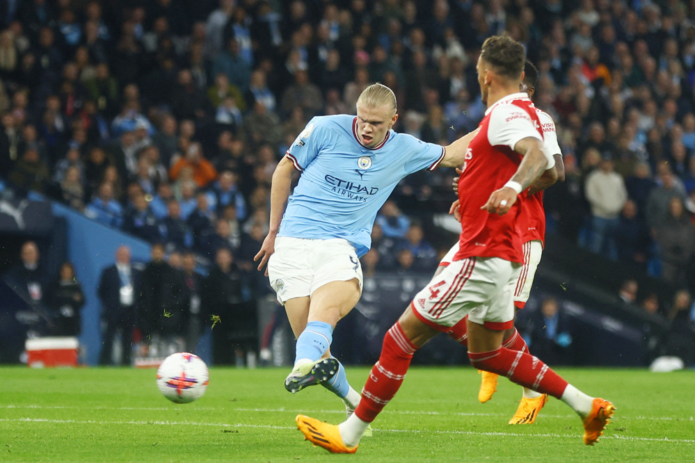 Erling Haaland tiếp tục solo vỗ mặt hàng thủ Arsenal. Tiếc rằng, pha kết thúc chân trái lại đi sạt cột dọc.