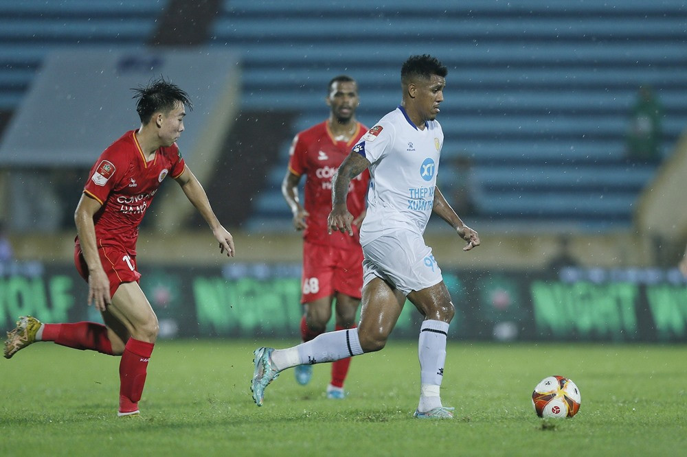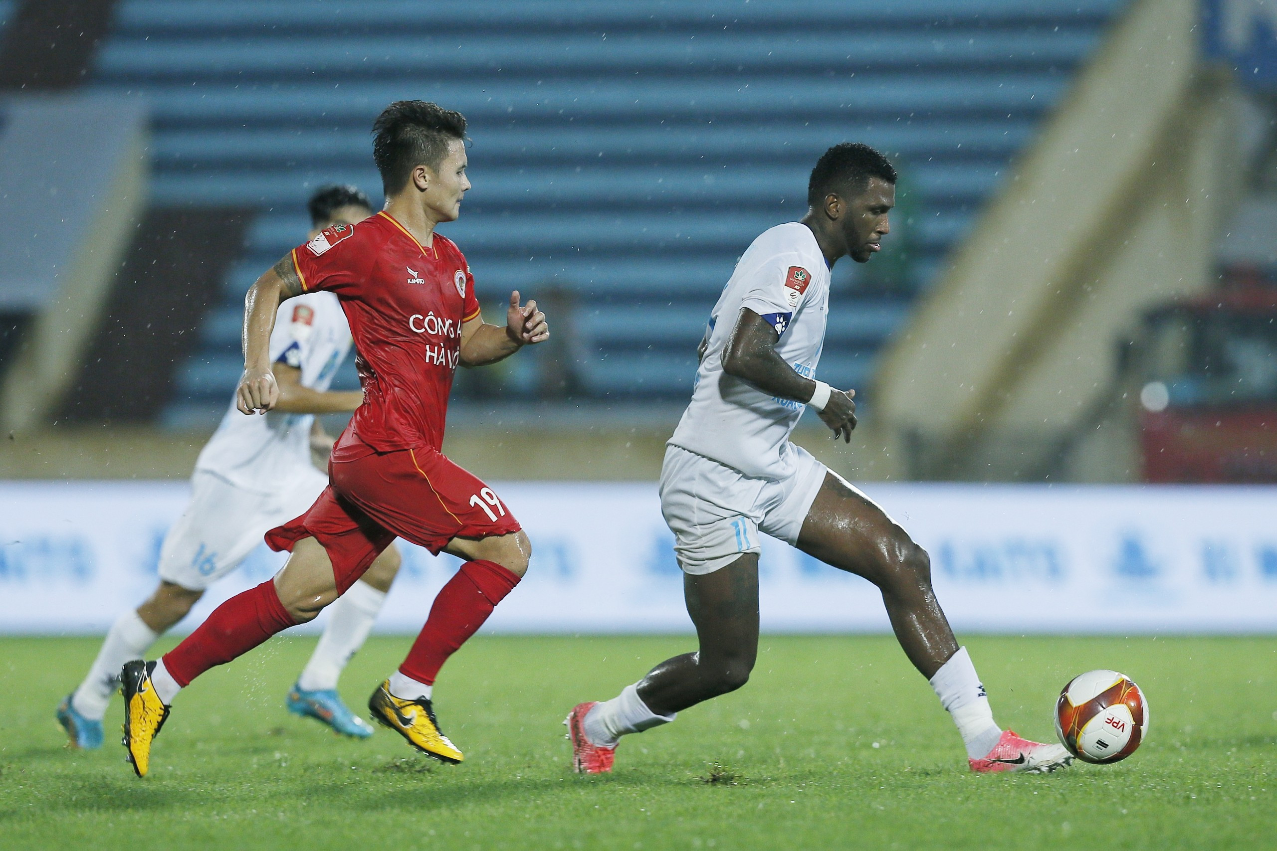 Quang Hải xâm nhập vòng cấm rồi trả bóng ngược ra cho Raphael Success quăng chân dứt điểm đưa bóng đi hơi cao so với khung thành Nam Định.