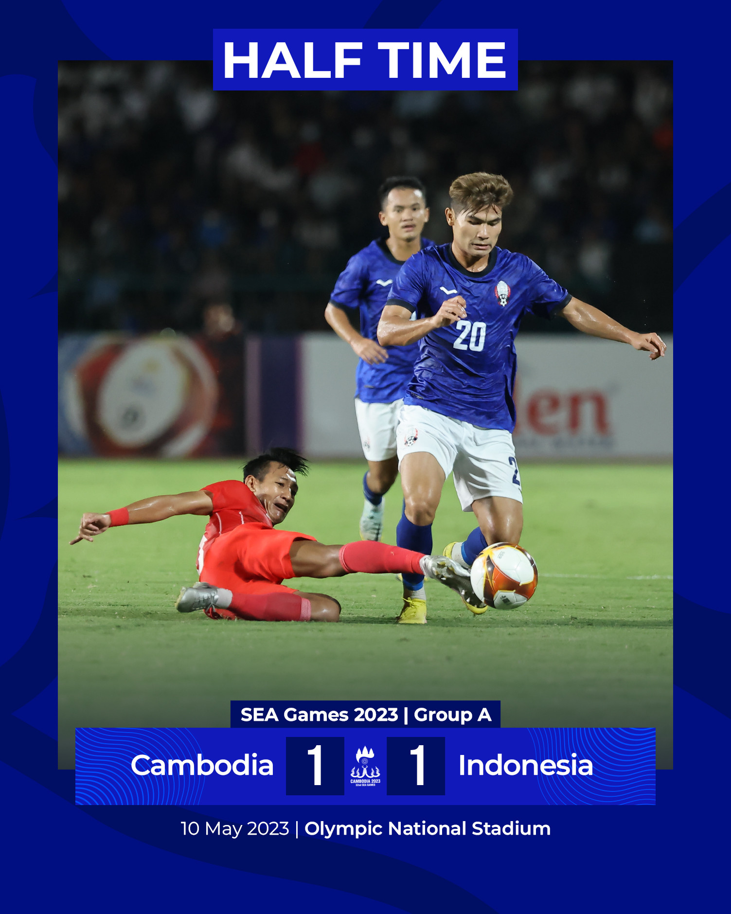 Bàn thắng (1-1, Sovannmakara): Từ quả phạt góc bên cánh phải, hậu vệ Sovannmakara thoải mái đánh đầu vào góc xa, bóng dội cột dọc đi vào lưới trong sự ngỡ ngàng của hàng thủ U22 Indonesia.
