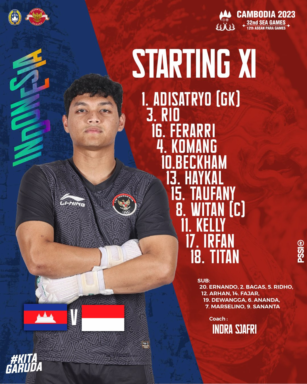 U22 Indonesia: Aidsatryo, Haykal, Ferarri, Rio, Beckham, Komang, Irfan, Titan, Taufany, Kelly, Witan.